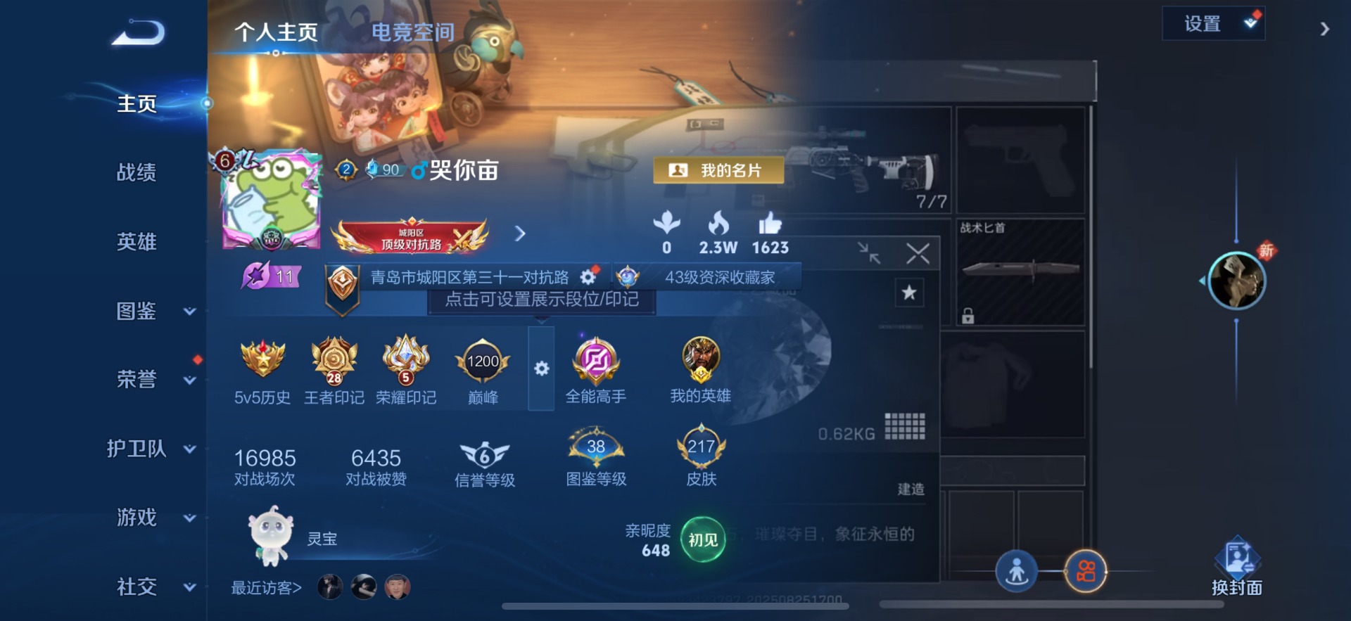 - PX_2074850-实名: 不可修改 贵族等级: V6 英雄数: 122 皮肤数: 105 限定皮: 遇见飞天,李小龙,梁祝,如梦令-后羿,寅虎·瑞焰,高山流水,猪悟能,匿光追影者,傲雪梅枪,寅虎·赤拳,玉兔公主,五谷丰年