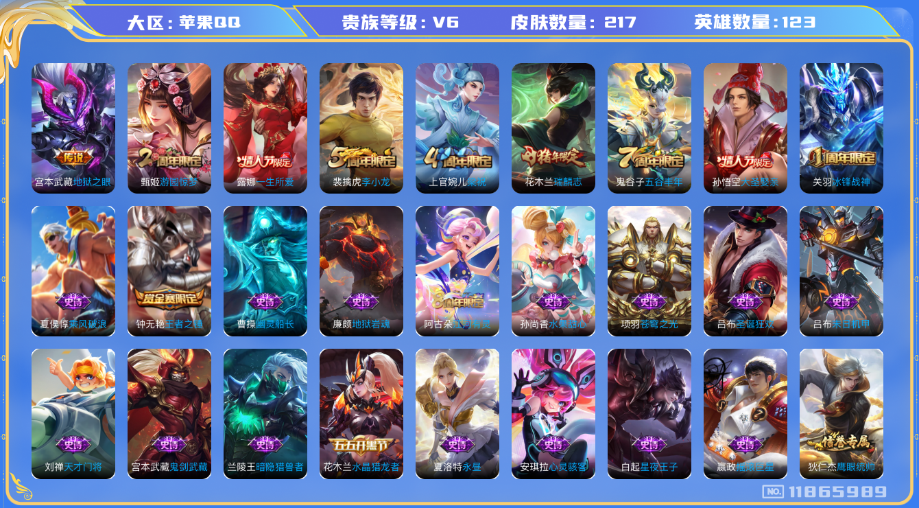 [11865989]V6 1传说 123英雄 217皮肤 可修改实名 优质装备:地狱之眼 珍宝阁皮:蔷薇恋人 限定皮:瑞麟志(木兰年限),五谷丰年,冰锋战神,游园惊梦,梁祝,李小龙,一生所爱,大圣娶亲 史诗皮:苍穹之光,永昼,江河有灵,蒙恬荣光圣徽,冰冠公主,末日机甲-吕布,摇滚巨星,水果甜心,天才门将,星夜王子,心灵骇客,暗隐猎兽者,幽灵船长,鬼剑武藏,地狱岩魂,乘风破浪,逐浪之夏,水晶猎龙者,金属风暴,原初追逐者,圣诞狂欢,鹰眼统帅,王者之锤,魅力维加斯,黎明之约,未来纪元-赵云