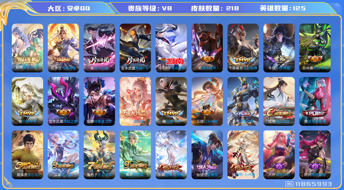 [11865993]V8 1典藏 1珍品无双 3珍品传说 14传说 125英雄 218皮肤 可修改实名 优质装备:馥梦繁花,九霄神辉(木兰典藏),怪盗基德,朽木白哉,黑崎一护,云鹰飞将(小将军),绛天战甲(鸡嘴战神),久胜战神,炽阳神光,一念神魔,末日机甲-孙尚香(绿蚂蚱),仲夏夜之梦(大飞蛾),地狱之眼,涂山容容 传说皮:续相思,幻光神枪 珍宝阁皮:胡桃夹子,蔷薇恋人 限定皮:愿照·九州拓(澜年限),愿照·千秋盛(女娲年限),逐霄战戟,陌上桑,鸣野蒿,至尊宝,高山流水,五谷丰年,李小龙,匿光追影者 史诗皮:赞萌露比,鸭鸭历险记-刘禅,器灵·浮梦炉,糖绘人间,化蝶舞,星界战将,龙之律动,石田雨龙,百相守梦-周瑜,茶境仙,破空之剑,蒙犽顽岩魄,琥珀纪元伽罗,上官婉儿群星魔术团,百相守梦-百里守约,百相守梦-黄忠,织梦人,守夜人,遇见神鹿,紫霞仙子,电玩小子(小书包),特工魅影,江河有灵,魅语,百解令(蒙犽),匿光破解者,冰冠公主,青蛇,偶像歌手,晚萤,暗夜猫娘,龙骑士(小龙虾),猫狗日记-大乔,乱世虎臣,节奏热浪,女仆咖啡,水果甜心,功夫厨神,暗隐猎兽者,幽灵船长,鬼剑武藏,心灵战警,地狱岩魂,拒霜思,月团寄思,水晶猎龙者,曙光守护者,热力回旋,箭羽风息,唤灵魅影,金属风暴,原初追逐者,圣诞狂欢,圣诞恋歌,鹰眼统帅