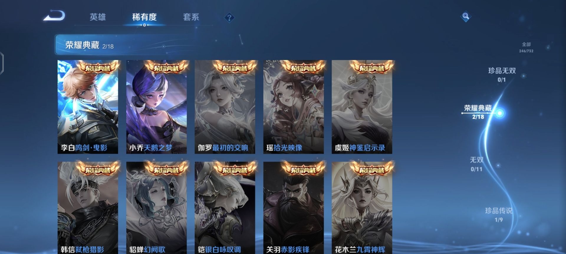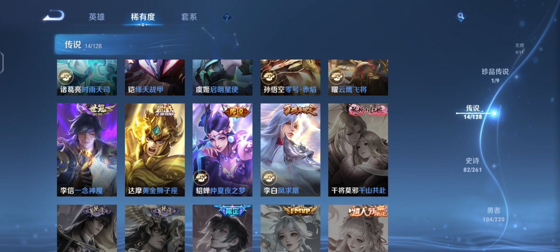 大乔白鹤梁神女,铠青龙志,伽罗天狼溯光者,孙膑天狼运算者,干将莫邪冰霜恋舞曲,牛魔奔雷神使,鲁班七号乒乒小将,项羽霸王别姬,吕布御风骁将,诸葛亮时雨天司,兰陵王默契交锋,公孙离祈雪灵祝,裴擒虎李小龙,上官婉儿梁祝,花木兰默契交锋,猪八戒猪悟能,孙悟空孙行者,孙悟空大圣娶亲,芈月白晶晶,雅典娜神奇女侠,赵云引擎之心,妲己时之奇旅,韩信逐梦之影,虞姬霸王别姬,王昭君凤凰于飞,关羽冰锋战神