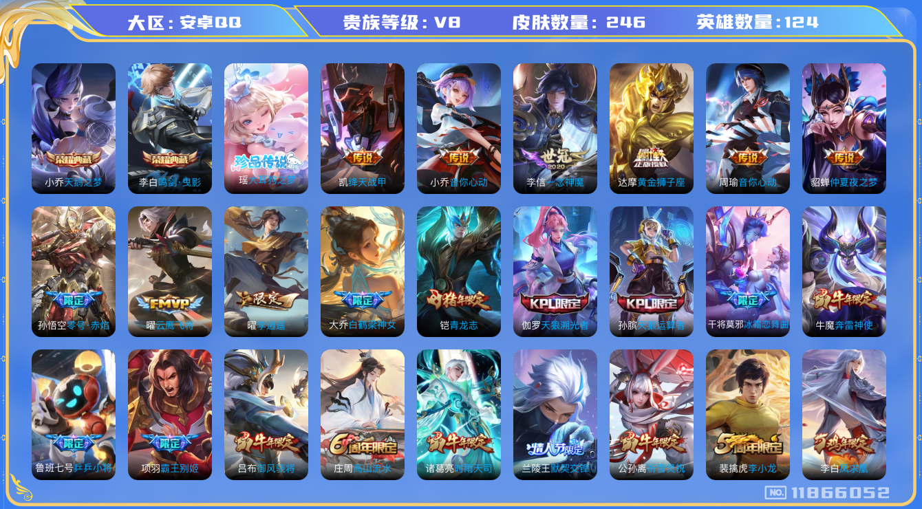 [11866052]V8 2典藏 1珍品传说 14传说 124英雄 246皮肤 可修改实名 优质装备:天鹅之梦(小乔典藏),鸣剑·曳影,大耳狗之梦,黄金狮子座,云鹰飞将(小将军),绛天战甲(鸡嘴战神),一念神魔,仲夏夜之梦(大飞蛾),音你心动-小乔,零号·赤焰,音你心动-周瑜,李逍遥 珍宝阁皮:优雅恋人,女武神 限定皮:凤求凰(白切鸡),凤凰于飞,白鹤梁神女,白晶晶,时雨天司(水龙头),高山流水,五谷丰年,青龙志(铠年限),冰锋战神,天狼运算者,梁祝,御风骁将(吕布年限),天狼溯光者,奔雷神使(牛魔年限),祈雪灵祝(雪兔子),李小龙,逐梦之影,霸王别姬-项羽,霸王别姬-虞姬,默契交锋-兰陵王,默契交锋-花木兰,孙行者,猪悟能,大圣娶亲,引擎之心,冰霜恋舞曲,乒乒小将,神奇女侠,时之奇旅-妲己 史诗皮:鸭鸭历险记-刘禅,化蝶舞,龙之律动,雪豹·霜爪,茶境仙,守夜人,遇见神鹿,紫霞仙子,电玩小子(小书包),特工魅影,千年之狐,魅语,百解令(蒙犽),冰冠公主,偶像歌手,猫狗日记-孙策,时之恋人-孙尚香,乱世虎臣,节奏热浪,修罗,女仆咖啡,摇滚巨星,水果甜心,绅士熊喵,星夜王子,心灵骇客,德古拉伯爵,幽灵船长,鬼剑武藏,心灵战警,乐园奇幻夜,诗语江南,纤云弄巧,繁星吟游(呼啦呼啦),缤纷独角兽,逐浪之夏,龙鼓争鸣,水晶猎龙者,金属风暴,圣诞狂欢,鹰眼统帅,魅力维加斯,黎明之约,无心,未来纪元-赵云