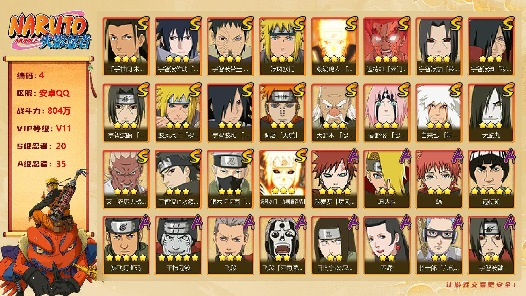 [11866048]【商品标题】:20S级忍者数-35A级忍者数 【S级忍者】:波风水门「秽土转生」(3星),宇智波鼬「秽土转生」(3星),宇智波斑「秽土转生」(3星),大野木「忍界大战」(3星),春野樱「忍界大战」(3星),宇智波带土「忍界大战」(3星),艾「忍界大战」(3星),宇智波鼬「须佐能乎」(3星),宇智波止水「须佐能乎」(3星),旗木卡卡西「须佐能乎」(3星),宇智波斑「木叶创立」(3星),千手柱间「木叶创立」(3星),自来也「舞之豪杰」(3星),大蛇丸(3星),波风水门(3星),漩涡鸣人「九喇嘛连结」(3星),迈特凯「死门」(3星),佩恩「天道」(3星),宇智波佐助「永恒万花筒」(3星),波风水门「九喇嘛连结」(3星) 【A级忍者】:艾「青年」(2星),长门「青年」(2星),迪达拉(2星),迪达拉「新春限定」(2星),迪达拉「秽土转生」(2星),大蛇丸「晓」(2星),奇拉比「忍界大战」(2星),飞段(3星),飞段「死司凭血」(2星),干柿鬼鲛(5星),漩涡博人「桃式显现」(2星),漩涡鸣人「九尾查克拉」(2星),迈特凯(5星),旗木卡卡西「幻之真容」(2星),桃地再不斩「秽土转生」(2星),我爱罗「疾风传」(4星),蝎(3星),小南「夏日泳装」(2星),猿飞阿斯玛(5星),宇智波鼬(2星),宇智波鼬「新春限定」(2星),宇智波佐助「须佐能乎」(2星),宇智波佐助「万花筒写轮眼」(2星),照美冥「夏日泳装」(2星),照美冥「五代目水影」(2星),日向宁次「忍界大战」(2星),宇智波带土「漂泊浪客」(2星),长十郎「六代目水影」(2星),李洛克「忍界大战」(2星),黑土「博人传」(2星),秋道丁次「忍界大战」(2星),千代「近松十人卫」(2星),神农「羁绊」(2星),不缘(2星),宇智波泉奈(2星)