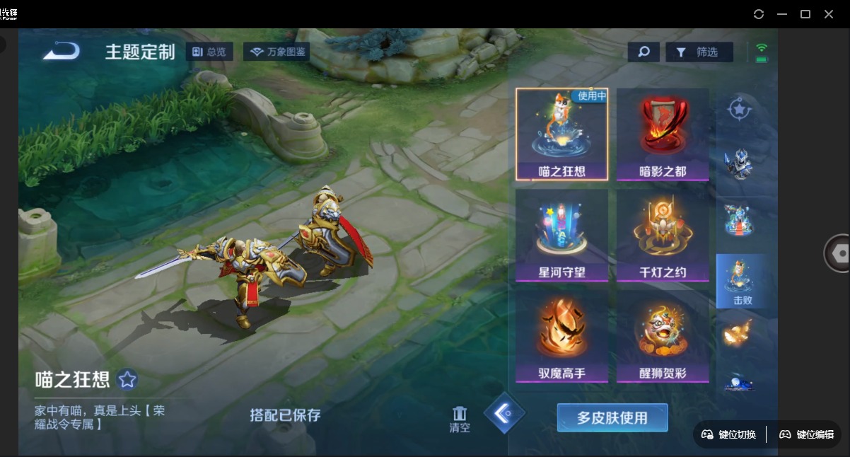 夏侯惇朔风刀,老夫子醍醐杖,沈梦溪星空之诺,盾山御銮,曹操烛龙,典韦穷奇,典韦蓝屏警告,牛魔御旌,鲁班七号狮舞东方,吕布猎兽之王,元歌云间偶戏,明世隐疑决卦,蒙犽狂想玩偶喵,马可波罗暗影游猎,鬼谷子原初探秘者,女娲朔望之晖,狄仁杰万华元夜,嬴政白昼王子,芈月重明,程咬金演武夺筹,李元芳银河之约,弈星混沌棋,米莱狄御霄,钟馗神迹守卫,钟馗驱傩正仪,狂铁御狮,太乙真人饕餮