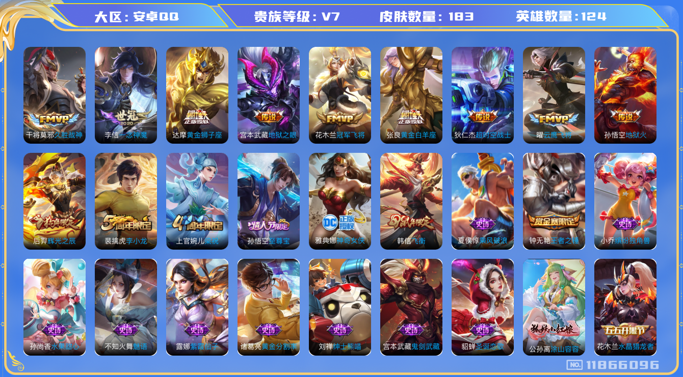 [11866096]V7 9传说 124英雄 183皮肤 可修改实名 优质装备:黄金狮子座,冠军飞将,云鹰飞将(小将军),黄金白羊座,久胜战神,一念神魔,地狱火,地狱之眼,超时空战士-狄仁杰,涂山容容 限定皮:至尊宝,飞衡(韩信年限),梁祝,李小龙,辉光之辰,神奇女侠 史诗皮:紫霞仙子,白龙吟,黄金分割率,特工魅影,千年之狐,魅语,冰冠公主,偶像歌手,修罗,女仆咖啡,水果甜心,绅士熊喵,功夫厨神,鬼剑武藏,纤云弄巧,繁星吟游(呼啦呼啦),缤纷独角兽,乘风破浪,逐浪之夏,水晶猎龙者,金属风暴,原初追逐者,圣诞恋歌,鹰眼统帅,王者之锤,魅力维加斯