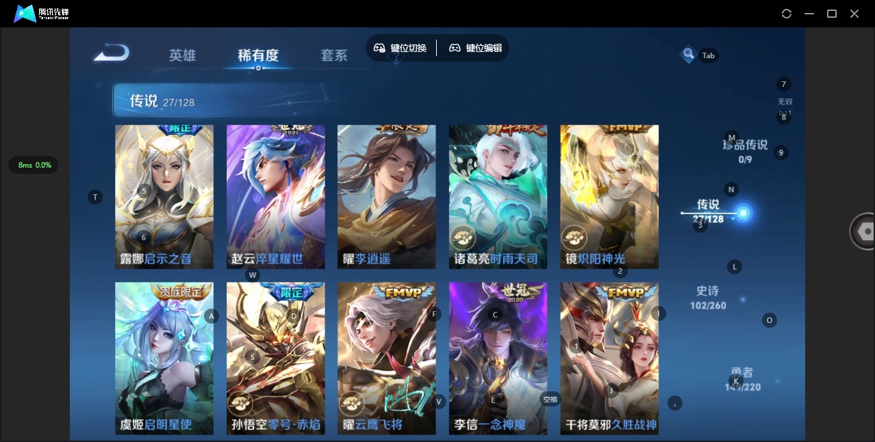 - [12001604]V8 1典藏 1珍品传说 32传说 124英雄 262皮肤 可修改实名 优质装备:鸣剑·曳影,江户川柯南,黄金狮子座,绛天战甲(鸡嘴战神),地狱之眼,飞鸢探春,时之恋人-刘备(电焊工),山海·炽霜斩(李信年限),炽翼辉光(娃娃菜牛角包),燃星之曲,澜逐花归海,琥珀纪元铠,琥珀纪元马超,牧神诗旅,玄雷天君 传说皮:乘龙·问璇玑(孙尚香年限),乘龙·铭钟鼎(赵云年限),乘龙·淬吴钩(孙策年限),貂蝉曦玄引,吕布曦玄引,典韦战鼓燎原,落雪白狼,幻光神枪 珍宝阁皮:胡桃夹子 限定皮:愿照·岁时盈(虞姬年限),愿照·众生和(妲己年限),逐霄战戟,鸣野蒿,夏侯惇霜北刀,补天,白晶晶,时雨天司(水龙头),齐天大圣,五谷丰年,武圣,梁祝,御风骁将(吕布年限),龙胆,逐梦之翼,烈魂,岱宗(典韦年限),虎魄,奔雷神使(牛魔年限),永曜之星,如梦令-嫦娥,如梦令-后羿,引擎之心,寅虎·心曲(虎婆),寅虎·赤拳(老虎年限),玉兔公主,山海·玄木吟(马可年限) 史诗皮:器灵·浮梦炉,星界战将,谪仙醉月,茶境仙,怒海争锋,撼地雄心,破空之剑,战舞者,琥珀纪元伽罗,曹操夜都魔契,超元猎域,乘龙·聚宝船(安琪拉年限),乘龙·忆丹青(大乔年限),百相守梦-百里守约,紫霞仙子,江河有灵,匿光侦查者,末日机甲-莱西奥,百解令(蒙犽),高渐离燃音魔法,蒙恬荣光圣徽,匿光破解者,冰冠公主,偶像歌手,晚萤,电玩·爆裂旋风,百相守梦(刘备),暗夜猫娘,末日机甲-吕布,猫狗日记-孙策,乱世虎臣,节奏热浪,女仆咖啡,摇滚巨星,水果甜心,绅士熊喵,天才门将,星夜王子,德古拉伯爵,暗隐猎兽者,鬼剑武藏,暗渊魔法,心灵战警,乐园奇幻夜,纤云弄巧,拒霜思,缤纷独角兽,乘风破浪,龙鼓争鸣,月团寄思,水晶猎龙者,曙光守护者,金属风暴,原初追逐者,鹰眼统帅,魅力维加斯,滕王阁序,顽趣-阿古朵,无心