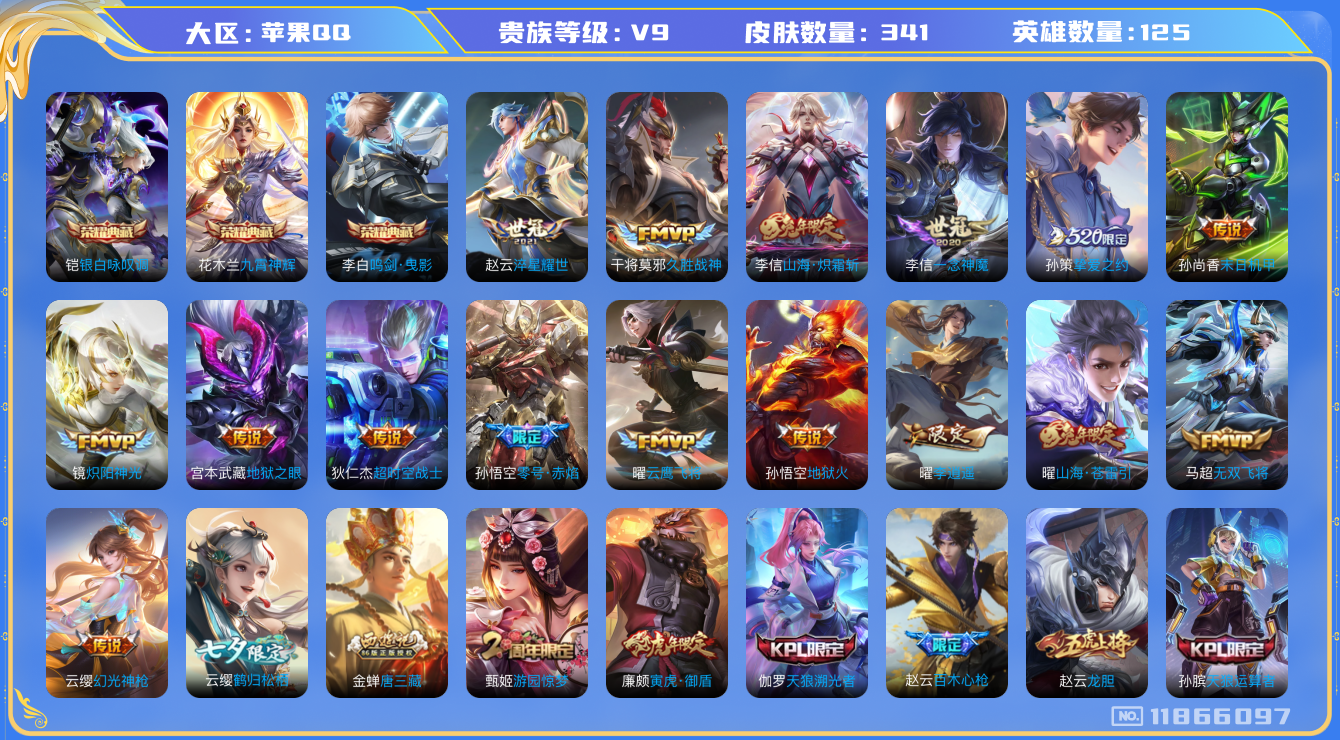 [11866097]V9 3典藏 27传说 125英雄 341皮肤 可修改实名 优质装备:鸣剑·曳影,九霄神辉(木兰典藏),银白咏叹调(倪克斯侍卫),云鹰飞将(小将军),久胜战神,炽阳神光,一念神魔,末日机甲-孙尚香(绿蚂蚱),地狱火,零号·赤焰,地狱之眼,李逍遥,淬星耀世,超时空战士-狄仁杰,挚爱之约,无双飞将,山海·炽霜斩(李信年限),山海·苍雷引(电光曜子),鹤归松栖(云缨) 传说皮:幻光神枪 珍宝阁皮:妄想食味,优雅恋人,女武神 限定皮:逐霄战戟,至尊宝,白虎志(电光耗子),凤求凰(白切鸡),武陵仙君(小桃花),傲雪梅枪,时雨天司(水龙头),神威(电光马子),瑞麟志(木兰年限),遇见飞天,诗剑行,怒海麟威,五谷丰年,天狼运算者,游园惊梦,梁祝,天狼狩猎者,龙胆,天狼溯光者,李小龙,逐梦之影,朱雀志(守约年限),如梦令-后羿,霸王别姬-虞姬,孙行者,大圣娶亲,寅虎·御盾(廉颇年限),寅虎·心曲(虎婆),百木心枪,玉兔公主,启示之音,无尽星芒,深海之息(深海大菠萝),唐三藏,山海·玄木吟(马可年限) 史诗皮:化蝶舞,石田雨龙,百相守梦-周瑜,百相守梦-百里守约,苍穹之光,电玩小子(小书包),黄金分割率,千年之狐,永昼,江河有灵,末日机甲-莱西奥,鹤归松栖(赵怀真),魅语,冰冠公主,偶像歌手,百相守梦(关羽),末日机甲-吕布,猫狗日记-孙策,猫狗日记-大乔,乱世虎臣,修罗,女仆咖啡,摇滚巨星,水果甜心,绅士熊喵,天才门将,星夜王子,心灵骇客,功夫厨神,德古拉伯爵,暗隐猎兽者,幽灵船长,鬼剑武藏,暗渊魔法,心灵战警,舞动绿茵,地狱岩魂,纤云弄巧,繁星吟游(呼啦呼啦),缤纷独角兽,乘风破浪,逐浪之夏,月团寄思,水晶猎龙者,曙光守护者,热力回旋,箭羽风息,唤灵魅影,金属风暴,原初追逐者,圣诞狂欢,圣诞恋歌,鹰眼统帅,王者之锤,魅力维加斯,黎明之约,赏金猎手,奇遇舞章,滕王阁序,寅虎·御盾,未来纪元-赵云