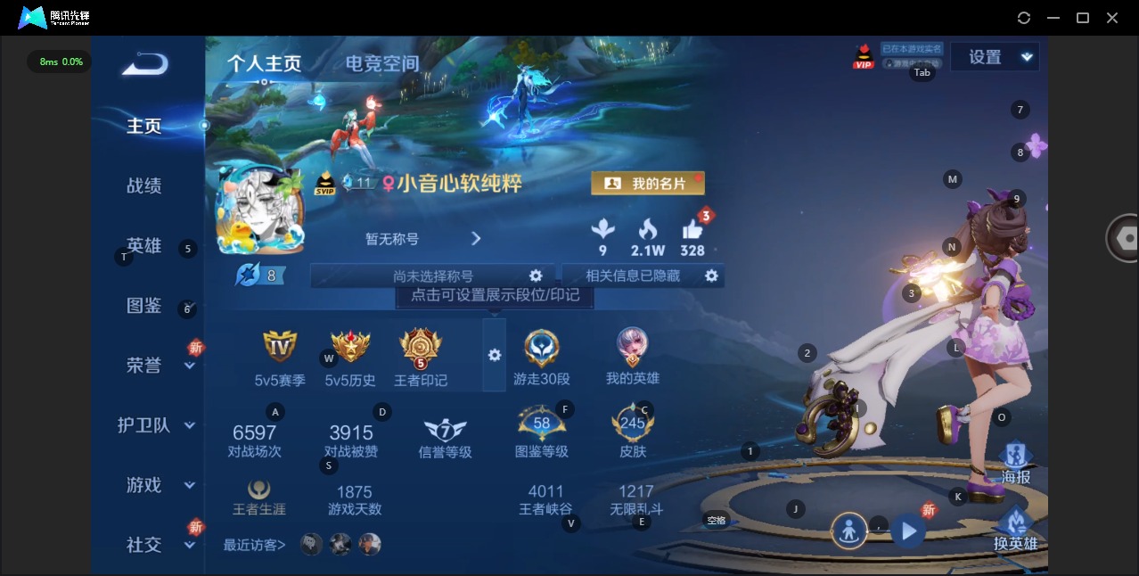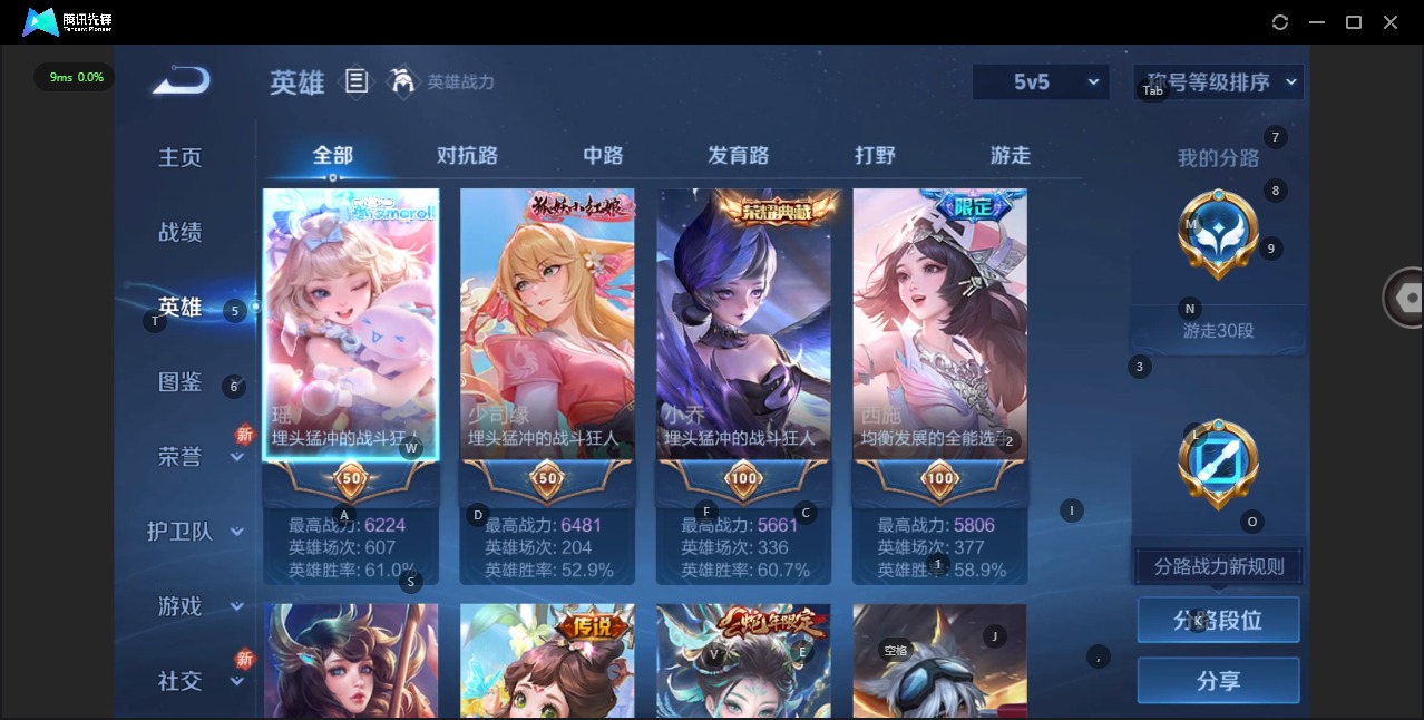 - PX_2102671-贵族等级: V6 英雄数: 120 皮肤数: 134 荣耀水晶: 鸣剑·曳影 传说皮: 云鹰飞将,澜逐花归海,幻光神枪 限定皮: 李小龙,青龙志,鸣野蒿,逐霄战戟,愿照·九州拓