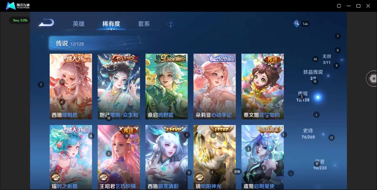 - PX_2104957-Q/至尊星耀/248皮肤/125英雄/1典藏/0珍品无双/0无双/5珍品传说/15传说/81史诗/9稀有英雄 【5 珍品传说】大耳狗之梦 瑶,黑崎一护 宫本武藏,怪盗基德 马可波罗,器灵·落星盏 嫦娥,江户川柯南 鲁班七号, 【1 典藏皮肤】神鉴启示录 虞姬, 【15 传说皮肤】启明星使 虞姬,逐花归海 澜,游龙清影 西施,仲夏夜之梦 貂蝉,祈雪灵祝 公孙离,炽阳神光 镜,黄