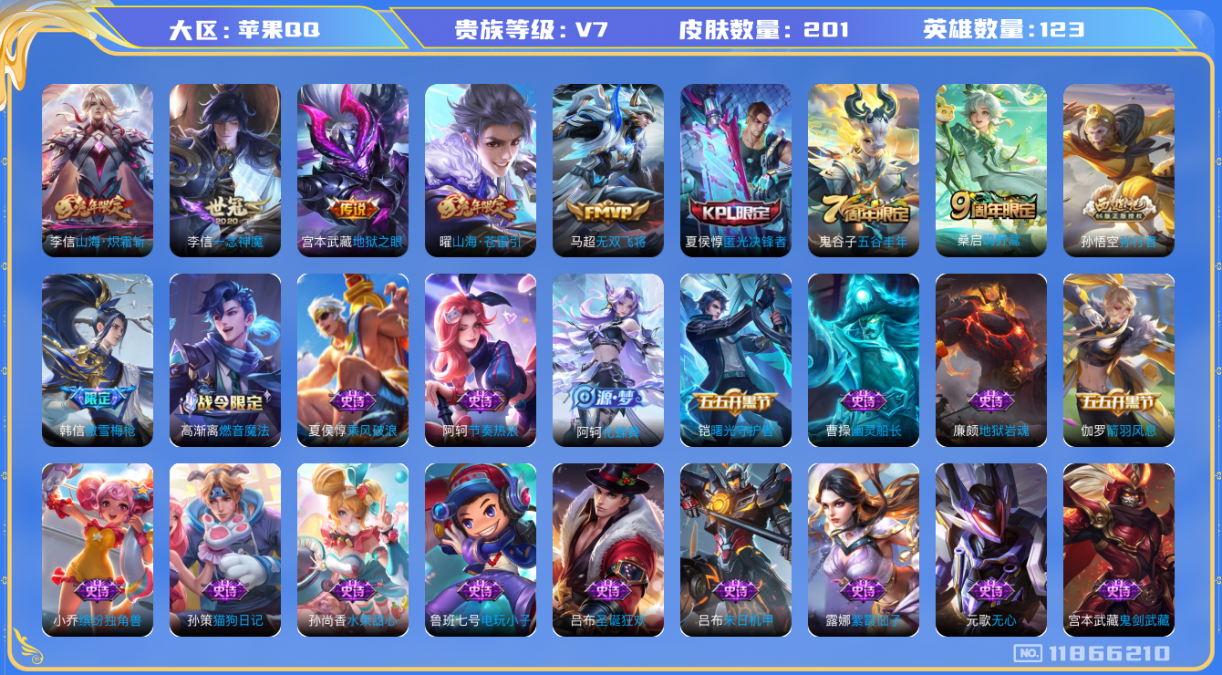 [11866210]V7 6传说 123英雄 201皮肤 可修改实名 优质装备:一念神魔,地狱之眼,无双飞将,山海·炽霜斩(李信年限),山海·苍雷引(电光曜子) 珍宝阁皮:胡桃夹子,玩趣恶龙 限定皮:鸣野蒿,傲雪梅枪,匿光决锋者,五谷丰年,孙行者 史诗皮:化蝶舞,龙之律动,紫霞仙子,电玩小子(小书包),永昼,百解令(蒙犽),高渐离燃音魔法,冰冠公主,偶像歌手,末日机甲-吕布,猫狗日记-孙策,节奏热浪,女仆咖啡,摇滚巨星,水果甜心,星夜王子,功夫厨神,暗隐猎兽者,幽灵船长,鬼剑武藏,心灵战警,舞动绿茵,地狱岩魂,拒霜思,缤纷独角兽,乘风破浪,逐浪之夏,水晶猎龙者,曙光守护者,箭羽风息,金属风暴,圣诞狂欢,鹰眼统帅,暗夜贵公子,魅力维加斯,黎明之约,赏金猎手,无心