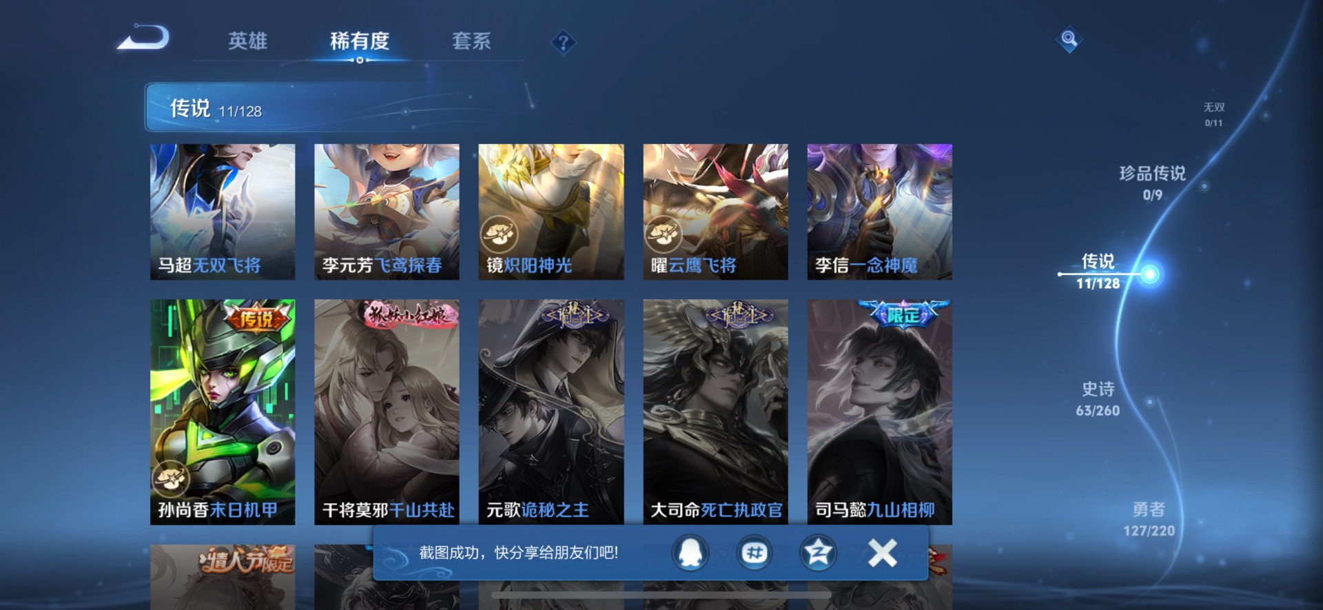 - [11625785]V6 1珍品传说 5传说 85英雄 81皮肤 可修改实名 女号 优质装备:黑崎一护,黄金狮子座,地狱之眼,涂山容容 传说皮:幻光神枪 限定皮:愿照·九州拓(澜年限),逐霄战戟,鸣野蒿 史诗皮:鸭鸭历险记-刘禅,化蝶舞,龙之律动,百相守梦-周瑜,茶境仙,百相守梦-百里守约,百相守梦-黄忠,紫霞仙子,千年之狐,无限星赏官,节奏热浪,水果甜心,鬼剑武藏,暗渊魔法,心灵战警,舞动绿茵,水晶猎龙者,曙光守护者,圣诞恋歌,鹰眼统帅,魅力维加斯