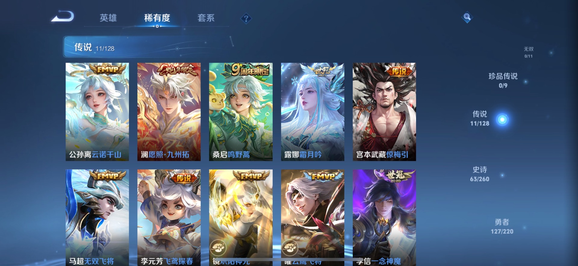 - [11688324]V8 1典藏 1珍品传说 22传说 125英雄 347皮肤 可修改实名 优质装备:九霄神辉(木兰典藏),怪盗基德,绛天战甲(鸡嘴战神),黄金白羊座,猫影幻舞,久胜战神,炽阳神光,一念神魔,地狱之眼,李逍遥,时之恋人-刘备(电焊工),淬星耀世,超时空战士-狄仁杰,无双飞将,音你闪耀(rap皮),山海·苍雷引(电光曜子),澜逐花归海 传说皮:祥瑞亨通,幻光神枪 珍宝阁皮:妄想食味,优雅恋人,蔷薇恋人 限定皮:愿照·九州拓(澜年限),鸣野蒿,至尊宝,傲雪梅枪,白晶晶,时雨天司(水龙头),神威(电光马子),飞衡(韩信年限),玄嵩(庄周年限),遇见飞天,高山流水,诗剑行,五谷丰年,冰锋战神,梁祝,岱宗(典韦年限),李小龙,逐梦之影,朱雀志(守约年限),默契交锋-花木兰,孙行者,玉兔公主 史诗皮:灵蛊蚀心,星界战将,谪仙醉月,茶境仙,百相守梦-百里守约,紫霞仙子,白龙吟,黄金分割率,特工魅影,千年之狐,永昼,江河有灵,魅语,百解令(蒙犽),高渐离燃音魔法,蒙恬荣光圣徽,青蛇,偶像歌手,电玩·爆裂旋风,暗夜猫娘,百相守梦(关羽),龙骑士(小龙虾),末日机甲-吕布,猫狗日记-孙策,猫狗日记-大乔,乱世虎臣,节奏热浪,修罗,女仆咖啡,摇滚巨星,水果甜心,绅士熊喵,天才门将,星夜王子,心灵骇客,功夫厨神,德古拉伯爵,暗隐猎兽者,幽灵船长,鬼剑武藏,心灵战警,乐园奇幻夜,舞动绿茵,地狱岩魂,诗语江南,繁星吟游(呼啦呼啦),拒霜思,缤纷独角兽,乘风破浪,逐浪之夏,水晶猎龙者,曙光守护者,箭羽风息,金属风暴,原初追逐者,圣诞狂欢,圣诞恋歌,鹰眼统帅,暗夜贵公子,魅力维加斯,黎明之约,无心,未来纪元-赵云