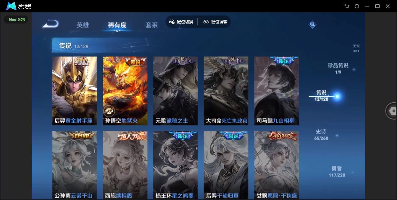 - PX_2076639-实名: 可修改 贵族等级: V5 英雄数: 122 皮肤数: 144 传说皮: 黄金射手座 限定皮: 梁祝,五谷丰年,鸣野蒿,愿照·福禄聚