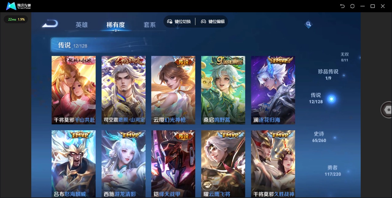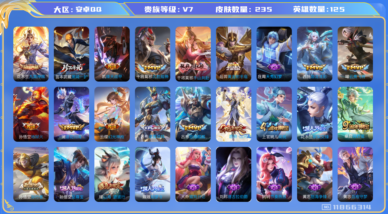 - [12025401]V7 1珍品传说 10传说 123英雄 166皮肤 可修改实名 优质装备:酷洛米之心,黄金狮子座,炽阳神光,地狱之眼,时之恋人-刘备(电焊工),超时空战士-狄仁杰,澜逐花归海 传说皮:乘龙·问璇玑(孙尚香年限),祥瑞亨通 珍宝阁皮:万物之道 限定皮:愿照·山河定(司空震年限),逐霄战戟,鸣野蒿,游园惊梦,孙行者 史诗皮:鸭鸭历险记-刘禅,化蝶舞,星界战将,龙之律动,石田雨龙,怒海争锋,破空之剑,蔬乡物语(鲁班七号),百相守梦-黄忠,织梦人,紫霞仙子,特工魅影,千年之狐,江河有灵,高渐离燃音魔法,无限星赏官,冰冠公主,白蛇,末日机甲-吕布,猫狗日记-孙策,修罗,女仆咖啡,水果甜心,天才门将,星夜王子,功夫厨神,暗隐猎兽者,幽灵船长,鬼剑武藏,暗渊魔法,天秀·启明,水晶猎龙者,金属风暴,圣诞狂欢,圣诞恋歌,鹰眼统帅,魅力维加斯,未来纪元-赵云