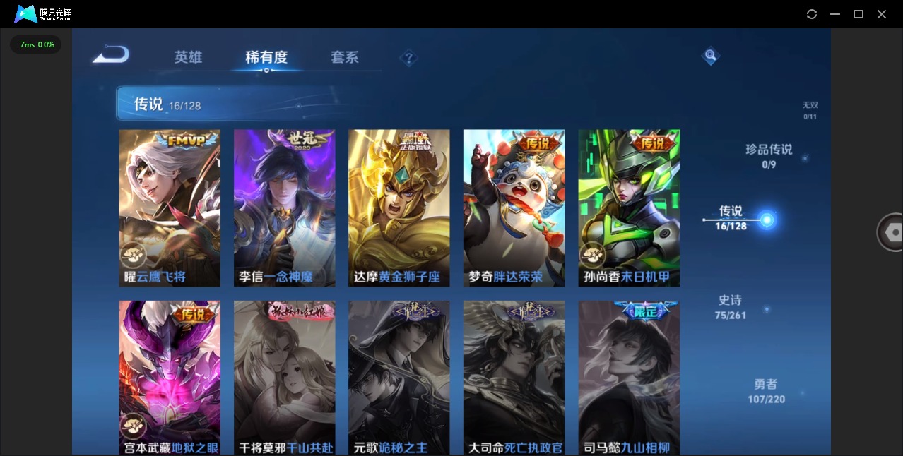 - PX_2095093-实名: 可修改 贵族等级: V7 英雄数: 123 皮肤数: 205 荣耀水晶: 星域神启,银白咏叹调 传说皮: 黄金射手座,绛天战甲,地狱火,地狱之眼,末日机甲-孙策,山海·炽霜斩,电玩·雷克斯 限定皮: 李小龙,游园惊梦,梁祝,神威,飞衡,高山流水,孙行者,五谷丰年,神器·万象笔,山海·玄木吟,冰霜神祇,齐天大圣