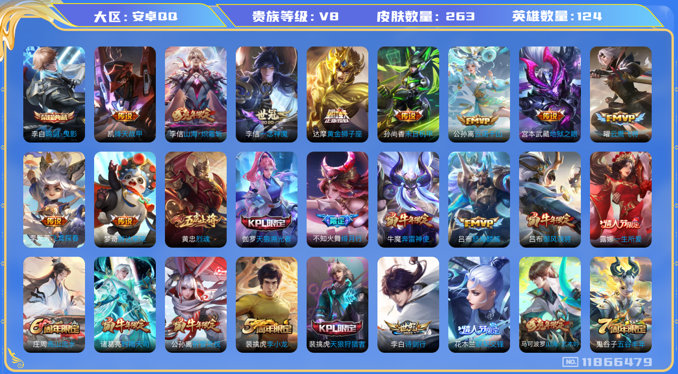 [11866479]V8 1典藏 16传说 124英雄 263皮肤 可修改实名 优质装备:鸣剑·曳影,黄金狮子座,云鹰飞将(小将军),绛天战甲(鸡嘴战神),一念神魔,末日机甲-孙尚香(绿蚂蚱),地狱之眼,飞鸢探春,胖达荣荣,山海·炽霜斩(李信年限),涂山容容 传说皮:云诺千山 珍宝阁皮:女武神,玩趣恶龙 限定皮:至尊宝,傲雪梅枪,绯月行,时雨天司(水龙头),神威(电光马子),山海·碧波行(瑶年限),高山流水,诗剑行,怒海麟威,五谷丰年,冰锋战神,御风骁将(吕布年限),天狼狩猎者,烈魂,天狼溯光者,奔雷神使(牛魔年限),祈雪灵祝(雪兔子),李小龙,朱雀志(守约年限),默契交锋-花木兰,孙行者,猪悟能,一生所爱,引擎之心,神奇女侠,山海·玄木吟(马可年限) 史诗皮:化蝶舞,灵蛊蚀心,龙之律动,百相守梦-黄忠,紫霞仙子,黄金分割率,永昼,雪夜绮愿(周瑜),魅语,蒙恬荣光圣徽,冰冠公主,偶像歌手,晚萤,暗夜猫娘,乱世虎臣,节奏热浪,修罗,女仆咖啡,水果甜心,绅士熊喵,天才门将,星夜王子,功夫厨神,德古拉伯爵,暗隐猎兽者,幽灵船长,鬼剑武藏,心灵战警,地狱岩魂,纤云弄巧,繁星吟游(呼啦呼啦),缤纷独角兽,乘风破浪,逐浪之夏,水晶猎龙者,箭羽风息,金属风暴,原初追逐者,圣诞恋歌,鹰眼统帅,魅力维加斯,赏金猎手,无心