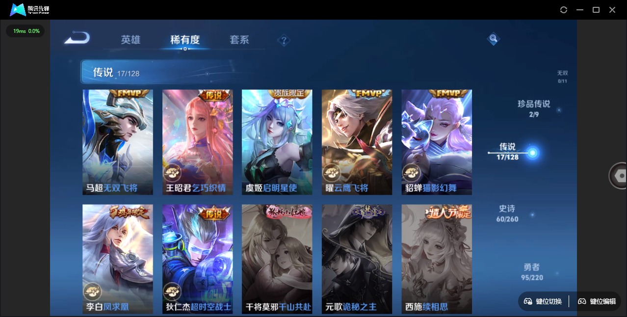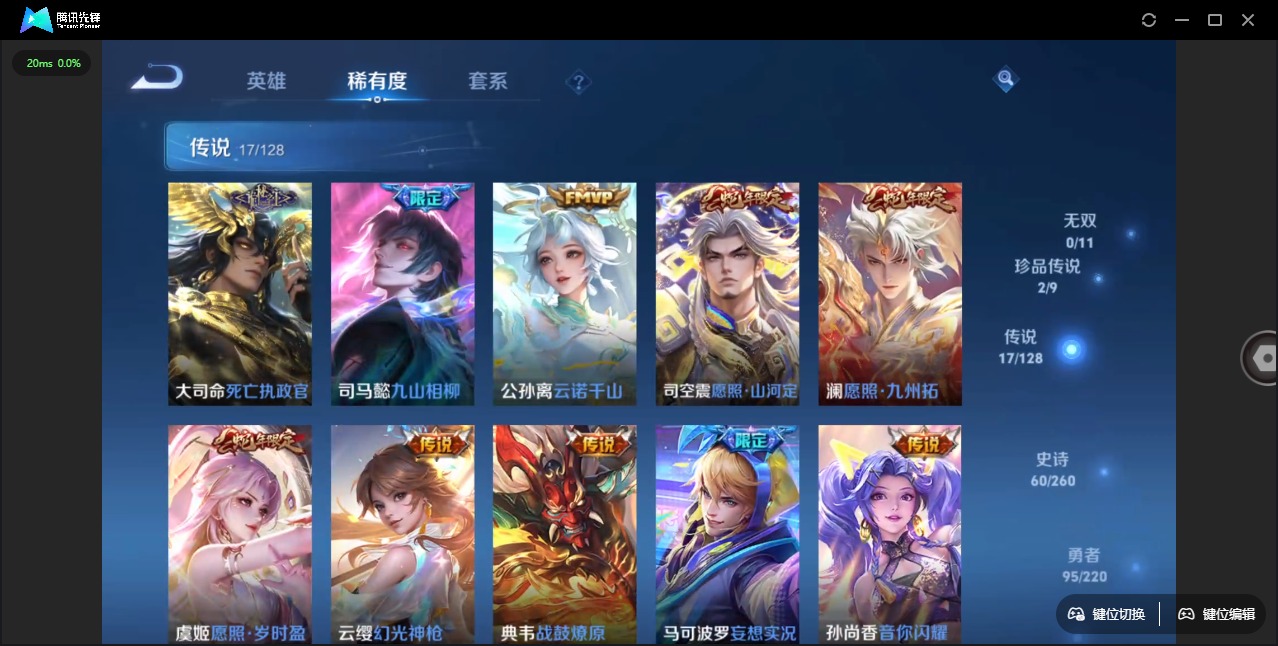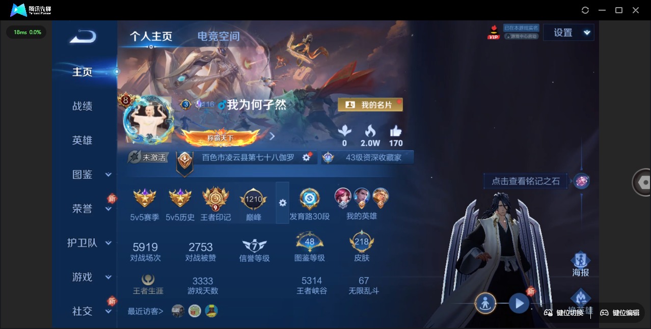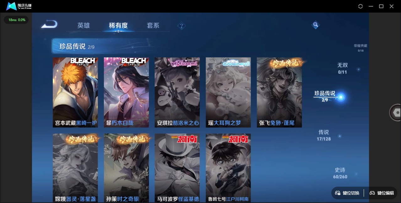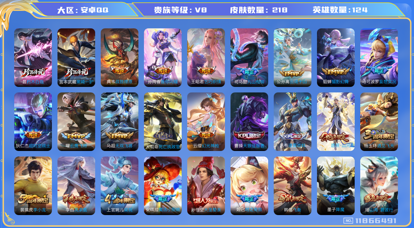 [11866491]V8 2珍品传说 17传说 124英雄 218皮肤 可修改实名 优质装备:朽木白哉,黑崎一护,云鹰飞将(小将军),猫影幻舞,乞巧织情,超时空战士-狄仁杰,无双飞将,音你闪耀(rap皮),妄想实况 传说皮:典韦战鼓燎原,死亡执政官,九山相柳,云诺千山,幻光神枪 珍宝阁皮:妄想食味 限定皮:愿照·九州拓(澜年限),愿照·岁时盈(虞姬年限),愿照·山河定(司空震年限),逐霄战戟,凤求凰(白切鸡),魔法小厨娘,飞衡(韩信年限),山海·碧波行(瑶年限),遇见飞天,降魔,梁祝,天狼征服者,李小龙,大圣娶亲,时之奇旅-妲己 史诗皮:鸭鸭历险记-刘禅,苍鳞隐世,器灵·浮梦炉,狼魂孤将,化蝶舞,龙之律动,石田雨龙,百相守梦-周瑜,茶境仙,琥珀纪元伽罗,百相守梦-百里守约,星界特工,百相守梦-黄忠,织梦人,守夜人,紫霞仙子,黄金分割率,特工魅影,千年之狐,无限星赏官,青蛇,猫狗日记-孙策,乱世虎臣,摇滚巨星,水果甜心,功夫厨神,德古拉伯爵,暗隐猎兽者,鬼剑武藏,地狱岩魂,纤云弄巧,繁星吟游(呼啦呼啦),乘风破浪,逐浪之夏,曙光守护者,热力回旋,箭羽风息,原初追逐者,圣诞狂欢,圣诞恋歌,鹰眼统帅,黎明之约,赏金猎手