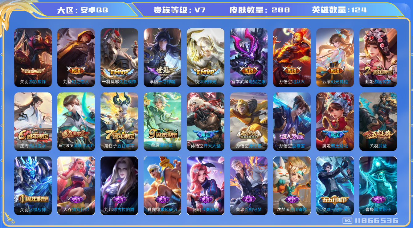 - [11874164]V7 1典藏 1珍品传说 6传说 124英雄 209皮肤 可修改实名 优质装备:拾光映像(瑶典藏),大耳狗之梦,黄金白羊座,云霓雀翎,时之恋人-刘备(电焊工),音你闪耀(rap皮) 珍宝阁皮:蔷薇恋人 限定皮:愿照·众生和(妲己年限),鸣野蒿,傲雪梅枪,五谷丰年,李小龙,山海·玄木吟(马可年限) 史诗皮:鸭鸭历险记-刘禅,化蝶舞,龙之律动,石田雨龙,茶境仙,战舞者,蒙犽顽岩魄,百相守梦-百里守约,百相守梦-黄忠,紫霞仙子,苍穹之光,电玩小子(小书包),千年之狐,江河有灵,匿光侦查者,百解令(蒙犽),冰冠公主,百相守梦(刘备),末日机甲-吕布,猫狗日记-大乔,时之恋人-孙尚香,乱世虎臣,节奏热浪,女仆咖啡,摇滚巨星,水果甜心,绅士熊喵,心灵骇客,功夫厨神,暗隐猎兽者,幽灵船长,鬼剑武藏,心灵战警,乐园奇幻夜,舞动绿茵,纤云弄巧,拒霜思,缤纷独角兽,乘风破浪,逐浪之夏,水晶猎龙者,曙光守护者,箭羽风息,金属风暴,圣诞狂欢,圣诞恋歌,鹰眼统帅,无心,未来纪元-赵云