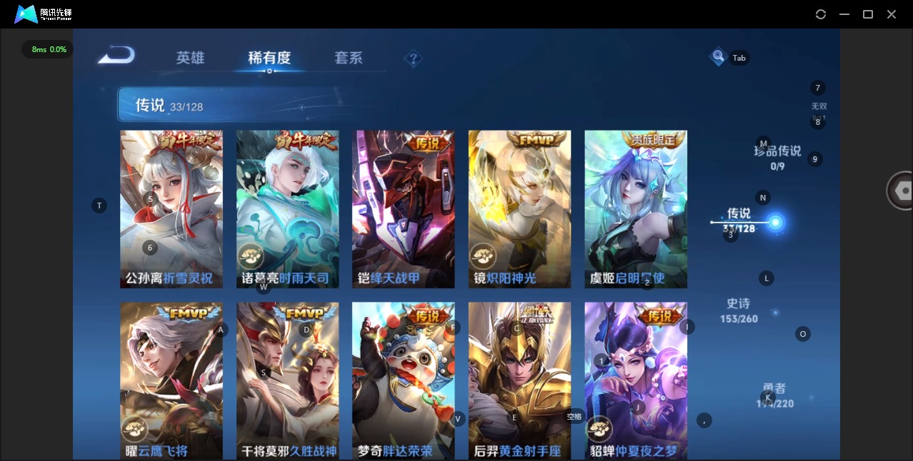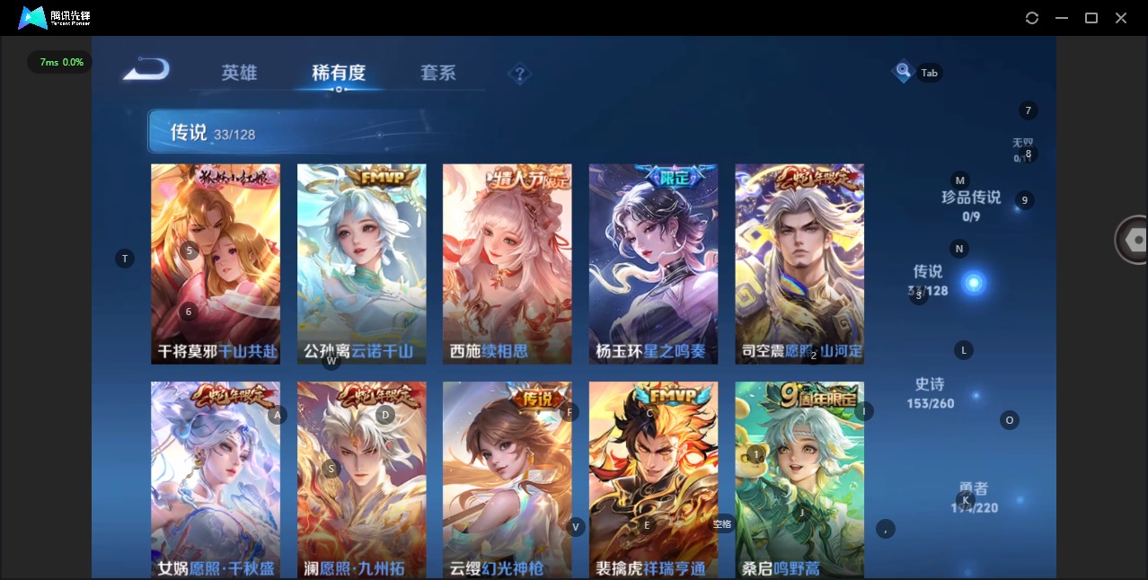 - PX_2086732-65 安卓QQ/至尊星耀/215皮肤/122英雄/1典藏/0珍品无双/1无双/0珍品传说/9传说/51史诗/8稀有英雄 【1 典藏皮肤】全息碎影 孙悟空, 【1 无双皮肤】真我赫兹 瑶, 【9 传说皮肤】启明星使 虞姬,诗剑行 李白,仲夏夜之梦 貂蝉,地狱之眼 宫本武藏,音你心动 周瑜,末日机甲 孙尚香,淬星耀世 赵云,太华 伽罗,冠军飞将 花木兰, 【51 史诗皮肤】电玩小