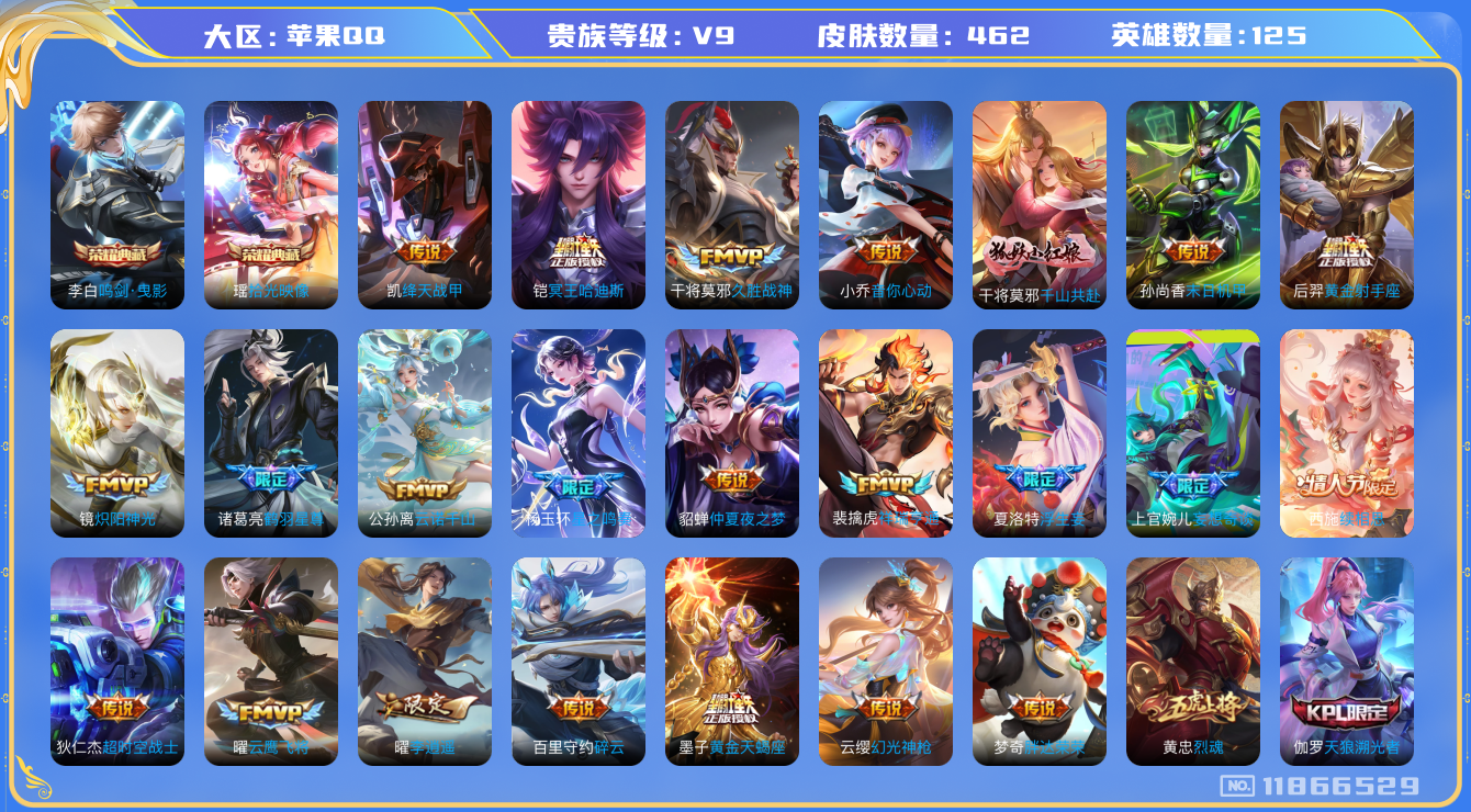 [11866529]V9 2典藏 33传说 125英雄 462皮肤 可修改实名 优质装备:鸣剑·曳影,拾光映像(瑶典藏),黄金射手座,云鹰飞将(小将军),绛天战甲(鸡嘴战神),久胜战神,炽阳神光,末日机甲-孙尚香(绿蚂蚱),仲夏夜之梦(大飞蛾),音你心动-小乔,胖达荣荣,李逍遥,超时空战士-狄仁杰,碎云,浮生妄,鹤羽星尊,妄想奇谈,黄金天蝎座,千山共赴,涂山容容 传说皮:云诺千山,铠冥王哈迪斯,续相思,星之鸣奏,祥瑞亨通,幻光神枪 珍宝阁皮:妄想食味,胡桃夹子,女武神 限定皮:愿照·九州拓(澜年限),愿照·山河定(司空震年限),愿照·千秋盛(女娲年限),逐霄战戟,鸣野蒿,至尊宝,凤求凰(白切鸡),凤凰于飞,傲雪梅枪,绯月行,魔法小厨娘,时雨天司(水龙头),神威(电光马子),飞衡(韩信年限),遇见飞天,高山流水,诗剑行,降魔,五谷丰年,天狼运算者,梁祝,御风骁将(吕布年限),龙胆,烈魂,天狼溯光者,逐梦之音,祈雪灵祝(雪兔子),天狼绘梦者,李小龙,逐梦之影,朱雀志(守约年限),孙行者,猪悟能,大圣娶亲,引擎之心,青春决赛季,乒乒小将,蜜橘之夏,玉兔公主,时之奇旅-妲己,神器·万象笔 史诗皮:鸭鸭历险记-刘禅,苍鳞隐世,器灵·浮梦炉,糖绘人间,绮世丹青,瑰影绮梦,化蝶舞,灵蛊蚀心,星界战将,龙之律动,雪豹·霜爪,藏狐·褐绒,布丁狗之誓,百相守梦-周瑜,戍鼓铭心,茶境仙,怒海争锋,破空之剑,涂山红红,东方月初,蒙犽顽岩魄,芈月浮光幕影,琥珀纪元伽罗,上官婉儿群星魔术团,蔬乡物语(鲁班七号),超元猎域,百相守梦-百里守约,星界特工,百相守梦-黄忠,织梦人,紫霞仙子,苍穹之光,电玩小子(小书包),白龙吟,黄金分割率,特工魅影,千年之狐,江河有灵,鹤归松栖(赵怀真),真我赫兹(百里守约),魅语,百解令(蒙犽),高渐离燃音魔法,蒙恬荣光圣徽,无限星赏官,冰冠公主,青蛇,偶像歌手,白蛇,晚萤,电玩·爆裂旋风,暗夜猫娘,末日机甲-吕布,猫狗日记-孙策,猫狗日记-大乔,时之恋人-孙尚香,乱世虎臣,节奏热浪,修罗,女仆咖啡,摇滚巨星,水果甜心,绅士熊喵,天才门将,星夜王子,心灵骇客,功夫厨神,德古拉伯爵,暗隐猎兽者,幽灵船长,鬼剑武藏,暗渊魔法,心灵战警,乐园奇幻夜,天秀·启明,舞动绿茵,地狱岩魂,诗语江南,纤云弄巧,繁星吟游(呼啦呼啦),拒霜思,缤纷独角兽,乘风破浪,逐浪之夏,龙鼓争鸣,月团寄思,水晶猎