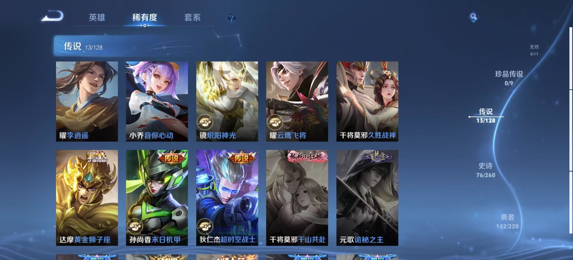 干将莫邪久胜战神,小乔音你心动,达摩黄金狮子座,镜炽阳神光,曜云鹰飞将,曜李逍遥,马超无双飞将,墨子黄金天蝎座