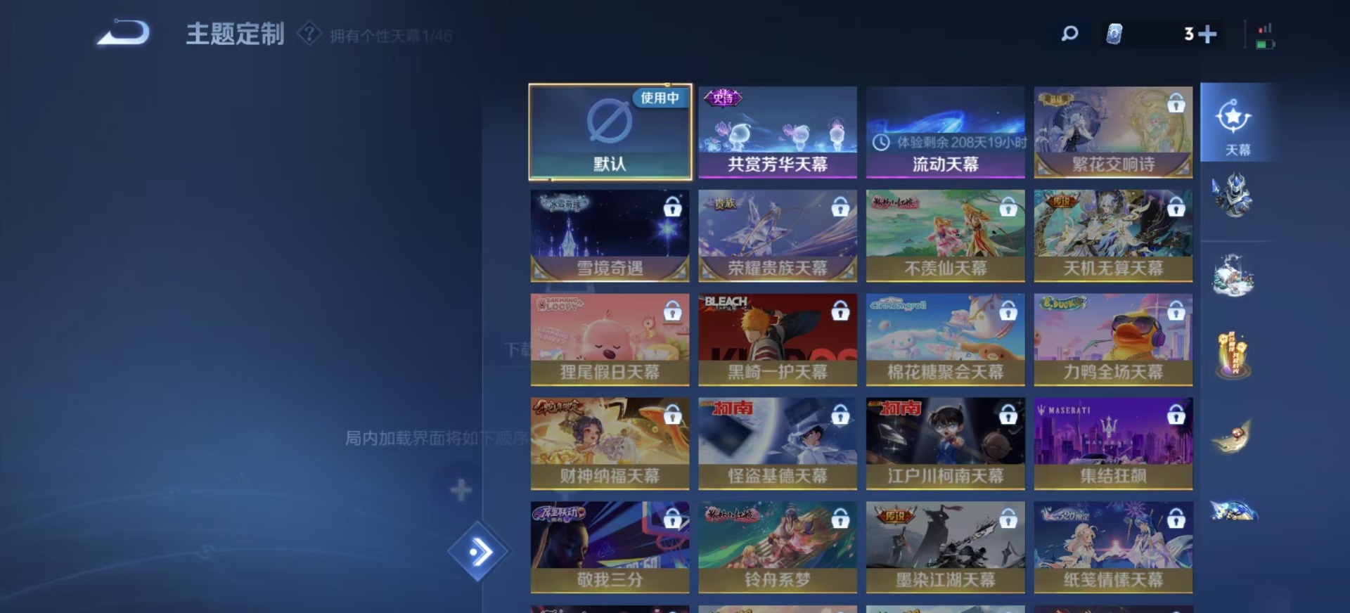 夏侯惇朔风刀,老夫子醍醐杖,沈梦溪星空之诺,沈梦溪大漠名商,盾山御銮,曹操烛龙,苏烈千军破阵,典韦穷奇,典韦蓝屏警告,达摩沙漠行僧,牛魔御旌,项羽苍威无极,鲁班七号狮舞东方,镜青焰无极,元歌云间偶戏,兰陵王金庭之子,裴擒虎擒涛扼浪,鲁班大师探海日志,明世隐疑决卦,鬼谷子原初探秘者,张良古海寻踪,女娲朔望之晖,桑启海盐诗旅,狄仁杰万华元夜,芈月重明,程咬金演武夺筹,李元芳银河之约,李元芳云中旅人,弈星混沌棋,米莱狄御霄,钟馗神迹守卫,钟馗驱傩正仪,狂铁御狮