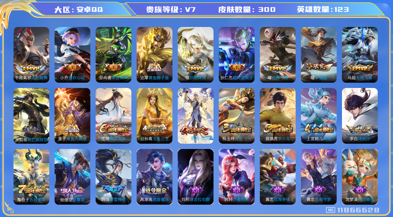 [11866628]V7 13传说 123英雄 300皮肤 可修改实名 女号 优质装备:黄金狮子座,云鹰飞将(小将军),久胜战神,炽阳神光,末日机甲-孙尚香(绿蚂蚱),音你心动-小乔,李逍遥,超时空战士-狄仁杰,无双飞将,黄金天蝎座,涂山容容 传说皮:死亡执政官 珍宝阁皮:蔷薇恋人,玩趣恶龙 限定皮:愿照·山河定(司空震年限),至尊宝,傲雪梅枪,遇见飞天,高山流水,诗剑行,五谷丰年,梁祝,李小龙,玉兔公主 史诗皮:糖绘人间,绮世丹青,星界战将,龙之律动,雪豹·霜爪,石田雨龙,百相守梦-周瑜,怒海争锋,上官婉儿群星魔术团,乘龙·聚宝船(安琪拉年限),百相守梦-百里守约,星界特工,百相守梦-黄忠,紫霞仙子,苍穹之光,电玩小子(小书包),特工魅影,千年之狐,魅语,高渐离燃音魔法,蒙恬荣光圣徽,冰冠公主,青蛇,末日机甲-吕布,猫狗日记-孙策,乱世虎臣,节奏热浪,女仆咖啡,水果甜心,绅士熊喵,天才门将,星夜王子,功夫厨神,德古拉伯爵,暗隐猎兽者,幽灵船长,鬼剑武藏,地狱岩魂,纤云弄巧,繁星吟游(呼啦呼啦),缤纷独角兽,逐浪之夏,月团寄思,水晶猎龙者,金属风暴,原初追逐者,圣诞狂欢,圣诞恋歌,鹰眼统帅,魅力维加斯,黎明之约,无心