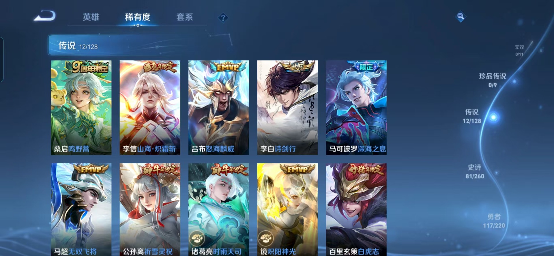 铠青龙志,吕布御风骁将,后羿如梦令,后羿辉光之辰,诸葛亮时雨天司,公孙离祈雪灵祝,裴擒虎李小龙,上官婉儿梁祝,李白诗剑行,马可波罗山海·玄木吟,马可波罗深海之息,桑启鸣野蒿,孙悟空大圣娶亲,孙悟空美猴王,百里玄策白虎志,马超神威,韩信飞衡,关羽冰锋战神