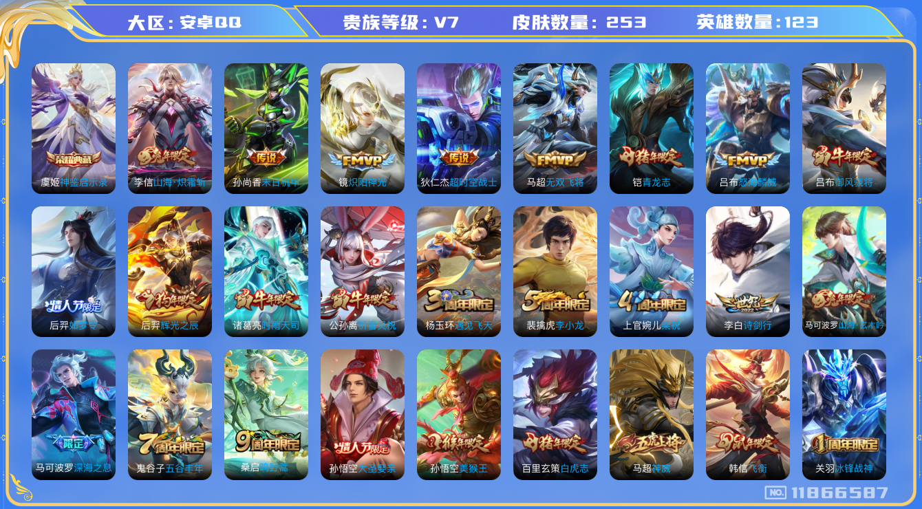 [11866587]V7 1典藏 12传说 123英雄 253皮肤 可修改实名 优质装备:神鉴启示录,炽阳神光,末日机甲-孙尚香(绿蚂蚱),超时空战士-狄仁杰,无双飞将,山海·炽霜斩(李信年限) 珍宝阁皮:蔷薇恋人,女武神 限定皮:鸣野蒿,白虎志(电光耗子),时雨天司(水龙头),神威(电光马子),飞衡(韩信年限),遇见飞天,诗剑行,怒海麟威,五谷丰年,青龙志(铠年限),冰锋战神,梁祝,御风骁将(吕布年限),祈雪灵祝(雪兔子),李小龙,辉光之辰,如梦令-后羿,大圣娶亲,美猴王,深海之息(深海大菠萝),山海·玄木吟(马可年限) 史诗皮:星界战将,破空之剑,琥珀纪元伽罗,紫霞仙子,苍穹之光,电玩小子(小书包),白龙吟,黄金分割率,特工魅影,千年之狐,江河有灵,匿光侦查者,末日机甲-莱西奥,百解令(蒙犽),蒙恬荣光圣徽,青蛇,电玩·爆裂旋风,末日机甲-吕布,猫狗日记-孙策,乱世虎臣,节奏热浪,修罗,女仆咖啡,摇滚巨星,水果甜心,绅士熊喵,星夜王子,心灵骇客,功夫厨神,德古拉伯爵,暗隐猎兽者,幽灵船长,鬼剑武藏,心灵战警,舞动绿茵,地狱岩魂,纤云弄巧,繁星吟游(呼啦呼啦),缤纷独角兽,乘风破浪,逐浪之夏,水晶猎龙者,曙光守护者,箭羽风息,金属风暴,原初追逐者,圣诞狂欢,圣诞恋歌,鹰眼统帅,魅力维加斯,黎明之约,赏金猎手,无心,未来纪元-赵云