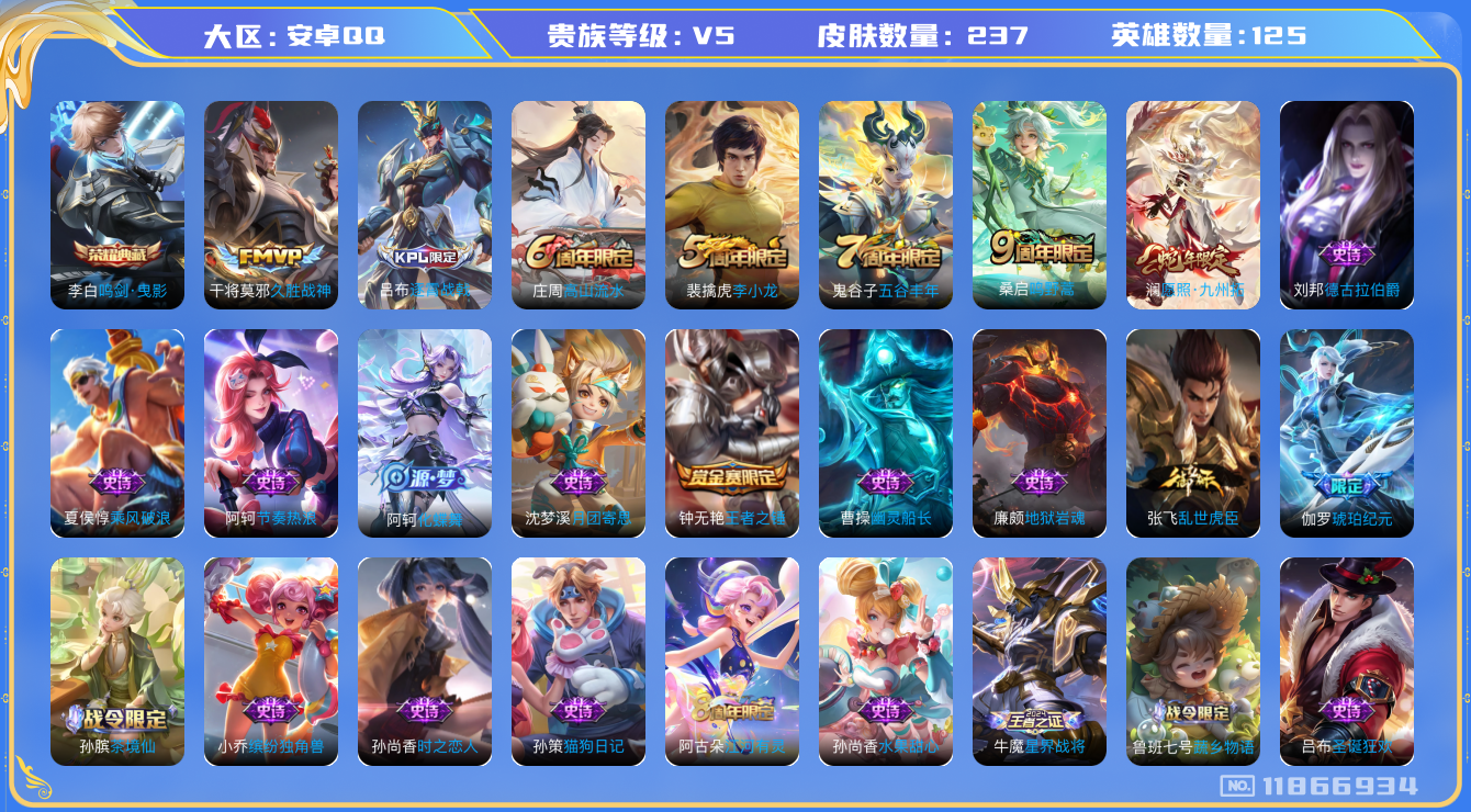 [11866934]V5 1典藏 3传说 125英雄 237皮肤 可修改实名 女号 优质装备:鸣剑·曳影,久胜战神 珍宝阁皮:妄想食味,胡桃夹子,蔷薇恋人 限定皮:愿照·九州拓(澜年限),逐霄战戟,鸣野蒿,高山流水,五谷丰年,李小龙 史诗皮:化蝶舞,星界战将,茶境仙,蒙犽顽岩魄,琥珀纪元伽罗,蔬乡物语(鲁班七号),紫霞仙子,黄金分割率,特工魅影,千年之狐,永昼,江河有灵,匿光侦查者,雪夜绮愿(周瑜),百解令(蒙犽),蒙恬荣光圣徽,冰冠公主,偶像歌手,电玩·爆裂旋风,末日机甲-吕布,猫狗日记-孙策,时之恋人-孙尚香,乱世虎臣,节奏热浪,修罗,女仆咖啡,摇滚巨星,水果甜心,绅士熊喵,星夜王子,心灵骇客,功夫厨神,德古拉伯爵,暗隐猎兽者,幽灵船长,鬼剑武藏,心灵战警,天秀·启明,舞动绿茵,地狱岩魂,纤云弄巧,拒霜思,缤纷独角兽,乘风破浪,逐浪之夏,月团寄思,水晶猎龙者,金属风暴,圣诞狂欢,圣诞恋歌,鹰眼统帅,王者之锤,暗夜贵公子,魅力维加斯,黎明之约,无心,未来纪元-赵云