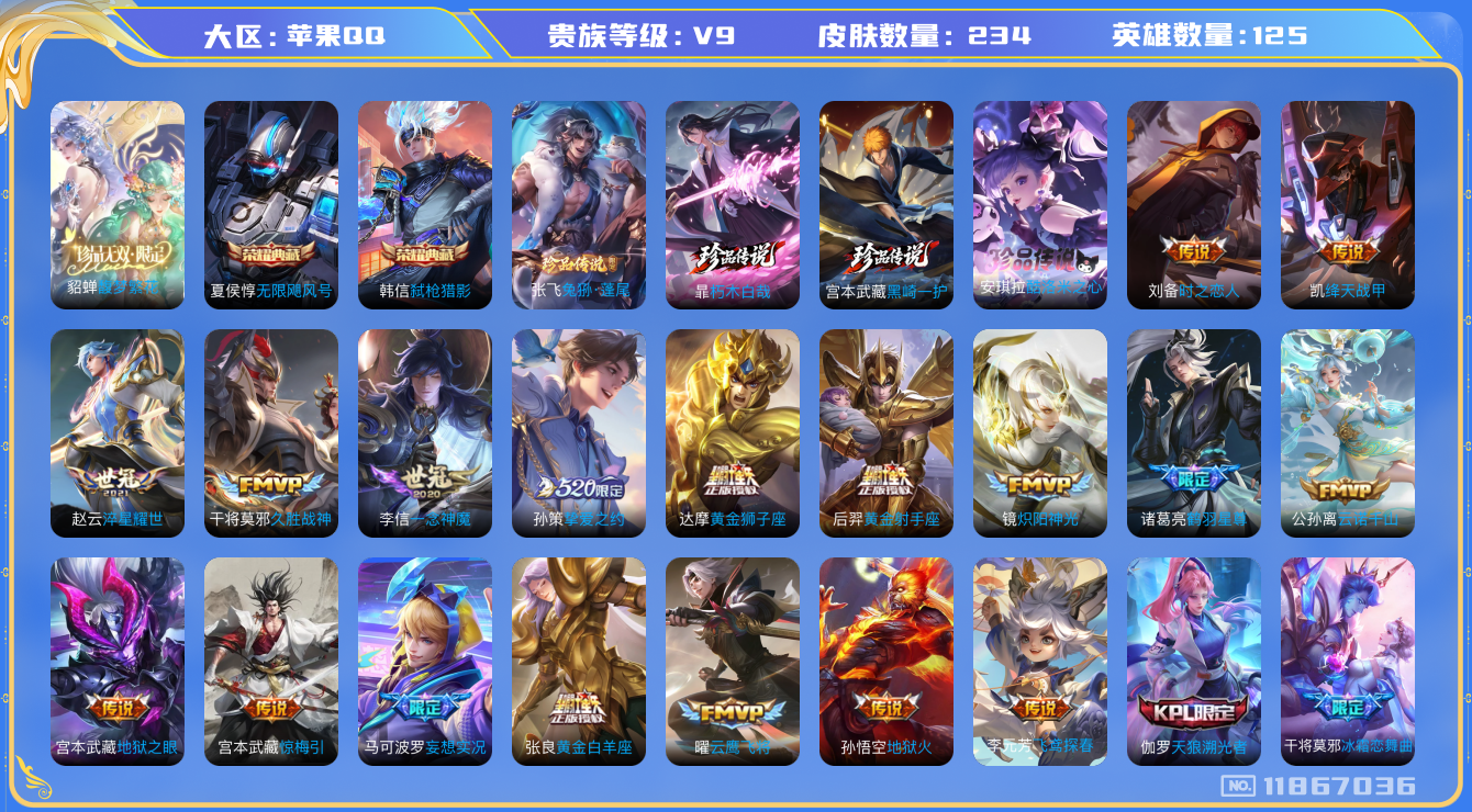 - [11884006]V7 5传说 124英雄 247皮肤 可修改实名 优质装备:炽阳神光,零号·赤焰,涂山容容 珍宝阁皮:优雅恋人,蔷薇恋人 限定皮:愿照·众生和(妲己年限),鸣野蒿,至尊宝,白虎志(电光耗子),白晶晶,冰锋战神,梁祝,御风骁将(吕布年限),天狼狩猎者,逐梦之星,天狼溯光者,李小龙,逐梦之光,霸王别姬-项羽,霸王别姬-虞姬,默契交锋-花木兰,大圣娶亲,冰霜恋舞曲 史诗皮:鸭鸭历险记-刘禅,星界战将,百相守梦-周瑜,茶境仙,破空之剑,蔬乡物语(鲁班七号),百相守梦-百里守约,百相守梦-黄忠,紫霞仙子,苍穹之光,电玩小子(小书包),黄金分割率,特工魅影,千年之狐,冰冠公主,偶像歌手,白蛇,晚萤,暗夜猫娘,猫狗日记-孙策,时之恋人-孙尚香,乱世虎臣,节奏热浪,修罗,女仆咖啡,天才门将,星夜王子,心灵骇客,功夫厨神,德古拉伯爵,暗隐猎兽者,幽灵船长,鬼剑武藏,心灵战警,乐园奇幻夜,地狱岩魂,诗语江南,纤云弄巧,繁星吟游(呼啦呼啦),缤纷独角兽,乘风破浪,逐浪之夏,鹰眼统帅,暗夜贵公子,魅力维加斯,黎明之约,未来纪元-赵云