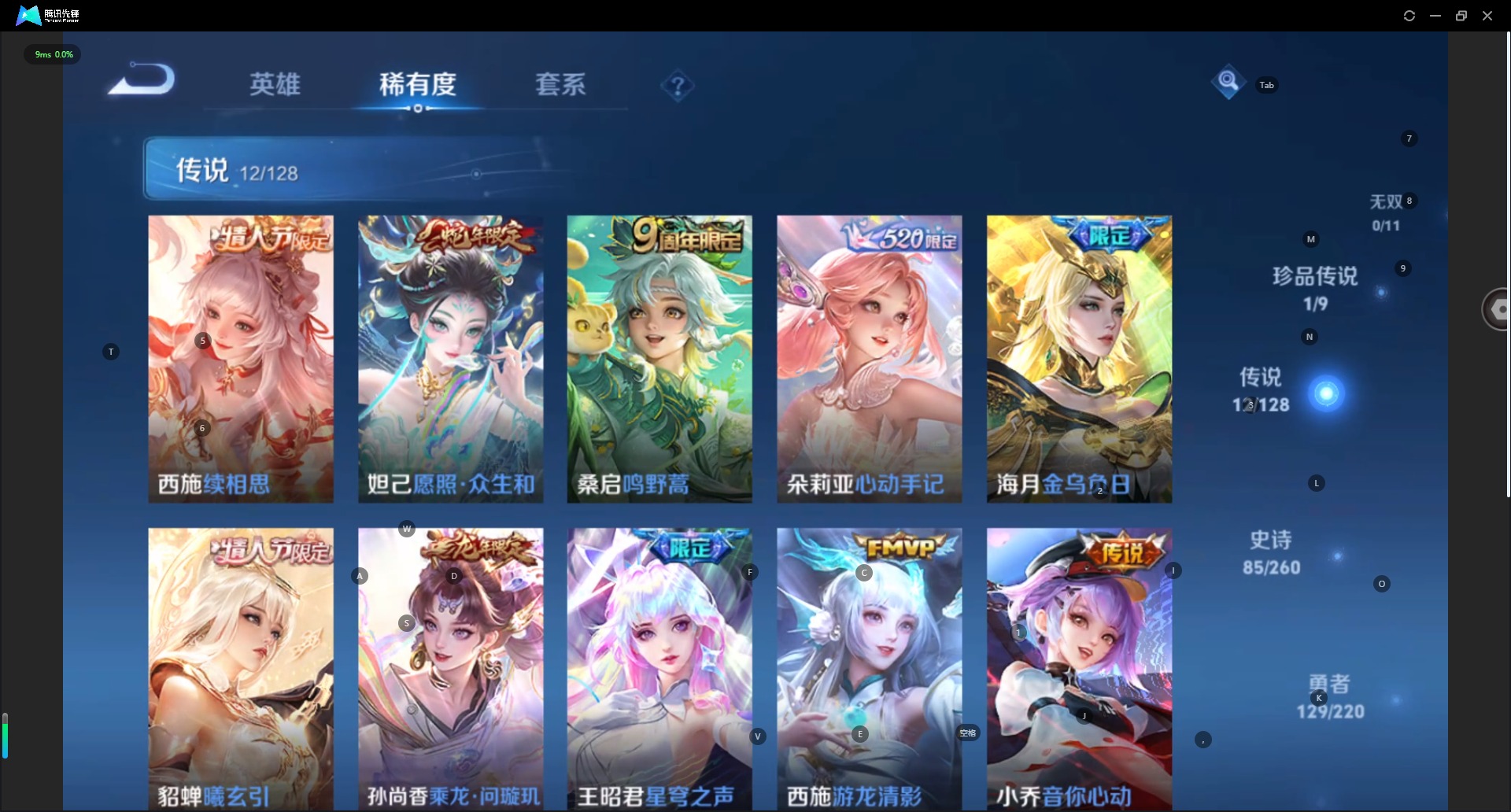 - [11688890]V8 2典藏 1无双 1珍品传说 23传说 125英雄 338皮肤 可修改实名 优质装备:天鹅之梦(小乔典藏),神鉴启示录,小乔时之魔女(小乔无双),冠军飞将,仲夏夜之梦(大飞蛾),音你心动-小乔,飞鸢探春,音你心动-周瑜,乞巧织情,游龙清影(小青龙),挚爱花嫁,无双飞将,山海·琳琅生(小乔年限),朵莉亚心动手记 珍品传说:兔狲·蓬尾 传说皮:幻光神枪 珍宝阁皮:妄想食味,胡桃夹子,优雅恋人 限定皮:愿照·岁时盈(虞姬年限),愿照·众生和(妲己年限),愿照·千秋盛(女娲年限),逐霄战戟,鸣野蒿,武陵仙君(小桃花),异界灵契(白毛香),补天,寅虎·展翼(孙膑年限),白鹤梁神女,遇见飞天,高山流水,五谷丰年,天狼运算者,梁祝,天狼溯光者,李小龙,霸王别姬-虞姬,纯白花嫁,冰霜恋舞曲,匿光追影者,女儿国国王,寅虎·瑞焰(虎皮蛋子),寅虎·心曲(虎婆),寅虎·赤拳(老虎年限),百木心枪,玉兔公主,深海之息(深海大菠萝),唐三藏,匿光启智者 史诗皮:鸭鸭历险记-刘禅,化蝶舞,龙之律动,石田雨龙,百相守梦-周瑜,茶境仙,怒海争锋,芈月浮光幕影,海诺心动手记,琥珀纪元伽罗,蔬乡物语(鲁班七号),乘龙·聚宝船(安琪拉年限),乘龙·忆丹青(大乔年限),百相守梦-百里守约,百相守梦-黄忠,紫霞仙子,苍穹之光,电玩小子(小书包),特工魅影,千年之狐,永昼,江河有灵,百解令(蒙犽),高渐离燃音魔法,蒙恬荣光圣徽,冰冠公主,青蛇,偶像歌手,白蛇,暗夜猫娘,龙骑士(小龙虾),末日机甲-吕布,猫狗日记-孙策,乱世虎臣,节奏热浪,女仆咖啡,摇滚巨星,水果甜心,绅士熊喵,天才门将,星夜王子,心灵骇客,时之奇旅-安琪拉,功夫厨神,德古拉伯爵,暗隐猎兽者,幽灵船长,鬼剑武藏,暗渊魔法,心灵战警,乐园奇幻夜,舞动绿茵,地狱岩魂,纤云弄巧,繁星吟游(呼啦呼啦),拒霜思,缤纷独角兽,乘风破浪,逐浪之夏,月团寄思,水晶猎龙者,曙光守护者,箭羽风息,唤灵魅影,金属风暴,圣诞狂欢,圣诞恋歌,鹰眼统帅,魅力维加斯,黎明之约,天秀·音浪,千筹问战,无心,未来纪元-赵云