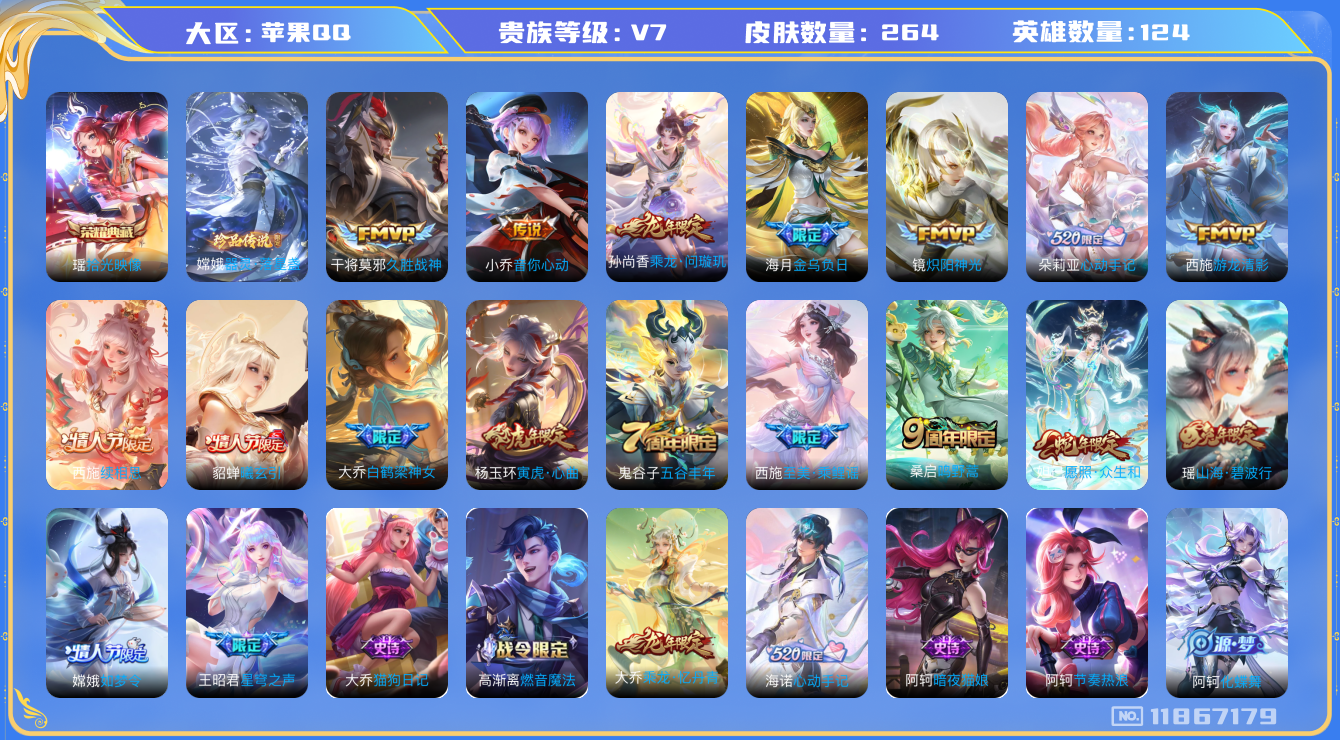 [11867179]V7 1典藏 1珍品传说 12传说 124英雄 264皮肤 可修改实名 女号 优质装备:拾光映像(瑶典藏),器灵·落星盏,久胜战神,炽阳神光,音你心动-小乔,游龙清影(小青龙),金乌负日,朵莉亚心动手记,涂山容容 传说皮:乘龙·问璇玑(孙尚香年限),貂蝉曦玄引,续相思 珍宝阁皮:妄想食味,蔷薇恋人 限定皮:愿照·众生和(妲己年限),鸣野蒿,星穹之声,白鹤梁神女,山海·碧波行(瑶年限),至美·乘鲤谣,五谷丰年,如梦令-嫦娥,寅虎·心曲(虎婆) 史诗皮:鸭鸭历险记-刘禅,化蝶舞,星界战将,龙之律动,石田雨龙,茶境仙,炽弈燎原,破空之剑,战舞者,涂山红红,蒙犽顽岩魄,海诺心动手记,琥珀纪元伽罗,上官婉儿群星魔术团,奇遇星旅,蔬乡物语(鲁班七号),乘龙·忆丹青(大乔年限),百相守梦-百里守约,织梦人,紫霞仙子,特工魅影,江河有灵,浮梦罗烟,魅语,百解令(蒙犽),高渐离燃音魔法,蒙恬荣光圣徽,匿光破解者,冰冠公主,青蛇,偶像歌手,电玩·爆裂旋风,暗夜猫娘,银翎春语,末日机甲-吕布,猫狗日记-大乔,乱世虎臣,节奏热浪,女仆咖啡,摇滚巨星,水果甜心,绅士熊喵,天才门将,星夜王子,心灵骇客,鬼剑武藏,心灵战警,乐园奇幻夜,舞动绿茵,地狱岩魂,诗语江南,纤云弄巧,拒霜思,缤纷独角兽,逐浪之夏,月团寄思,水晶猎龙者,金属风暴,原初追逐者,圣诞狂欢,圣诞恋歌,鹰眼统帅,魅力维加斯,奇遇舞章,无心,未来纪元-赵云