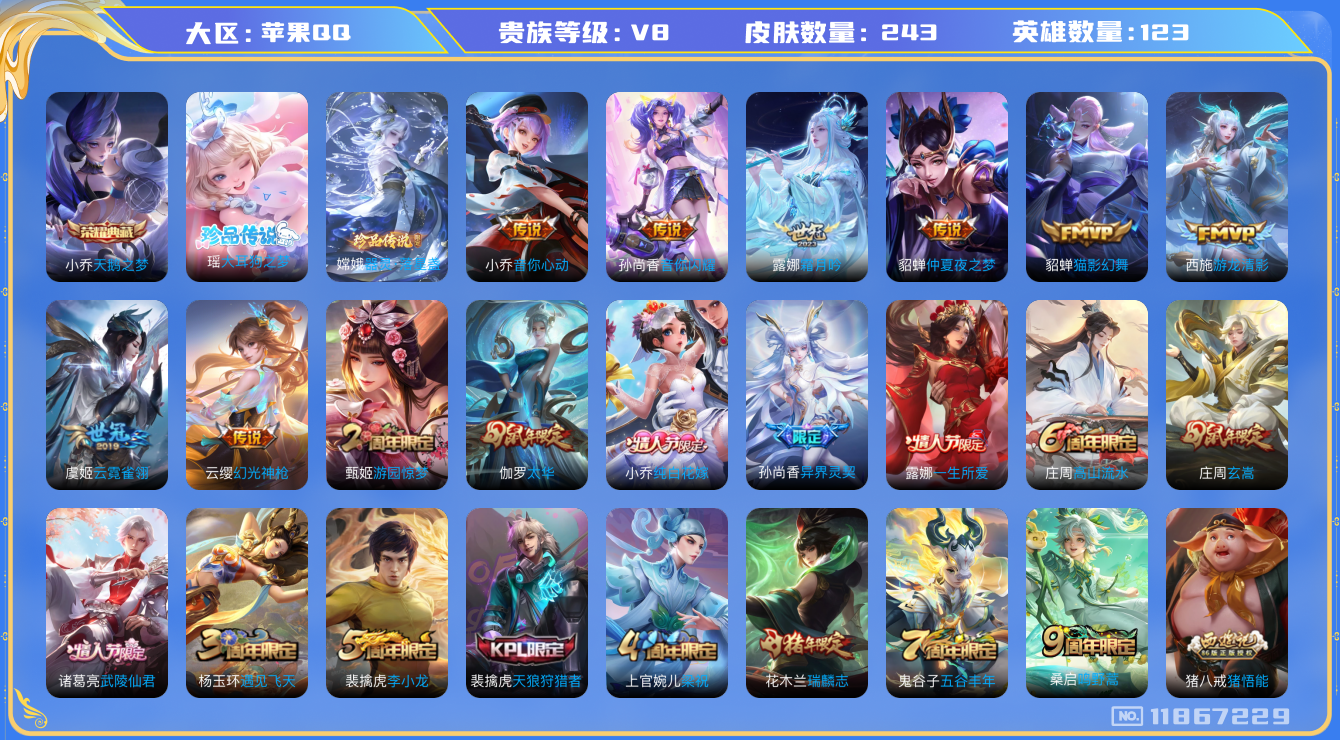 [11867229]V8 1典藏 2珍品传说 16传说 123英雄 243皮肤 可修改实名 优质装备:天鹅之梦(小乔典藏),器灵·落星盏,大耳狗之梦,猫影幻舞,云霓雀翎,仲夏夜之梦(大飞蛾),音你心动-小乔,游龙清影(小青龙),音你闪耀(rap皮),霜月吟,涂山容容 传说皮:幻光神枪 珍宝阁皮:胡桃夹子,蔷薇恋人 限定皮:愿照·众生和(妲己年限),映山客,鸣野蒿,太华(伽罗年限),武陵仙君(小桃花),异界灵契(白毛香),前尘镜,时之彼端,玄嵩(庄周年限),瑞麟志(木兰年限),遇见飞天,高山流水,五谷丰年,游园惊梦,梁祝,天狼狩猎者,李小龙,如梦令-嫦娥,奇迹圣诞,纯白花嫁,猪悟能,一生所爱,时之奇旅-妲己 史诗皮:化蝶舞,石田雨龙,百相守梦-黄忠,织梦人,遇见神鹿,特工魅影,江河有灵,魅语,无限星赏官,冰冠公主,青蛇,偶像歌手,末日机甲-吕布,时之恋人-孙尚香,节奏热浪,女仆咖啡,摇滚巨星,水果甜心,天才门将,心灵骇客,时之奇旅-安琪拉,暗隐猎兽者,幽灵船长,鬼剑武藏,心灵战警,舞动绿茵,繁星吟游(呼啦呼啦),拒霜思,缤纷独角兽,乘风破浪,逐浪之夏,箭羽风息,唤灵魅影,圣诞狂欢,圣诞恋歌,鹰眼统帅,暗夜贵公子,魅力维加斯,奇遇舞章,未来纪元-赵云