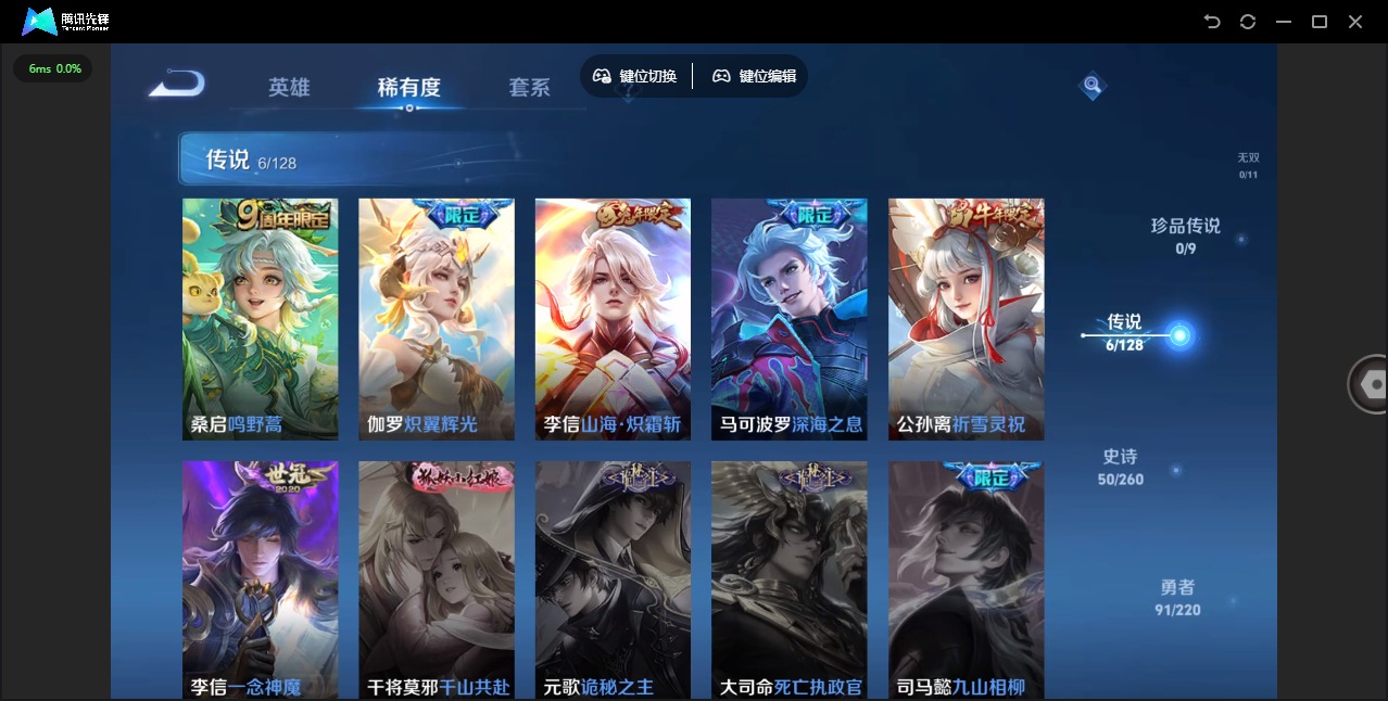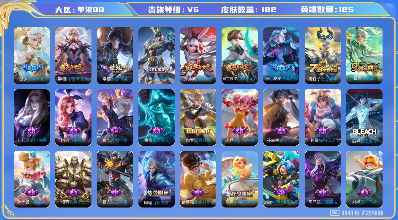 [11867298]V6 6传说 125英雄 182皮肤 可修改实名 优质装备:一念神魔,山海·炽霜斩(李信年限),炽翼辉光(娃娃菜牛角包),涂山容容 珍宝阁皮:万物之道,优雅恋人 限定皮:逐霄战戟,鸣野蒿,五谷丰年,祈雪灵祝(雪兔子),深海之息(深海大菠萝),山海·玄木吟(马可年限) 史诗皮:鸭鸭历险记-刘禅,龙之律动,石田雨龙,百相守梦-周瑜,百相守梦-黄忠,苍穹之光,黄金分割率,特工魅影,蒙恬荣光圣徽,冰冠公主,电玩·爆裂旋风,末日机甲-吕布,猫狗日记-孙策,时之恋人-孙尚香,节奏热浪,女仆咖啡,水果甜心,天才门将,心灵骇客,功夫厨神,德古拉伯爵,幽灵船长,鬼剑武藏,暗渊魔法,心灵战警,舞动绿茵,缤纷独角兽,水晶猎龙者,箭羽风息,金属风暴,圣诞恋歌,鹰眼统帅,魅力维加斯,黎明之约,奇遇舞章,无心,未来纪元-赵云