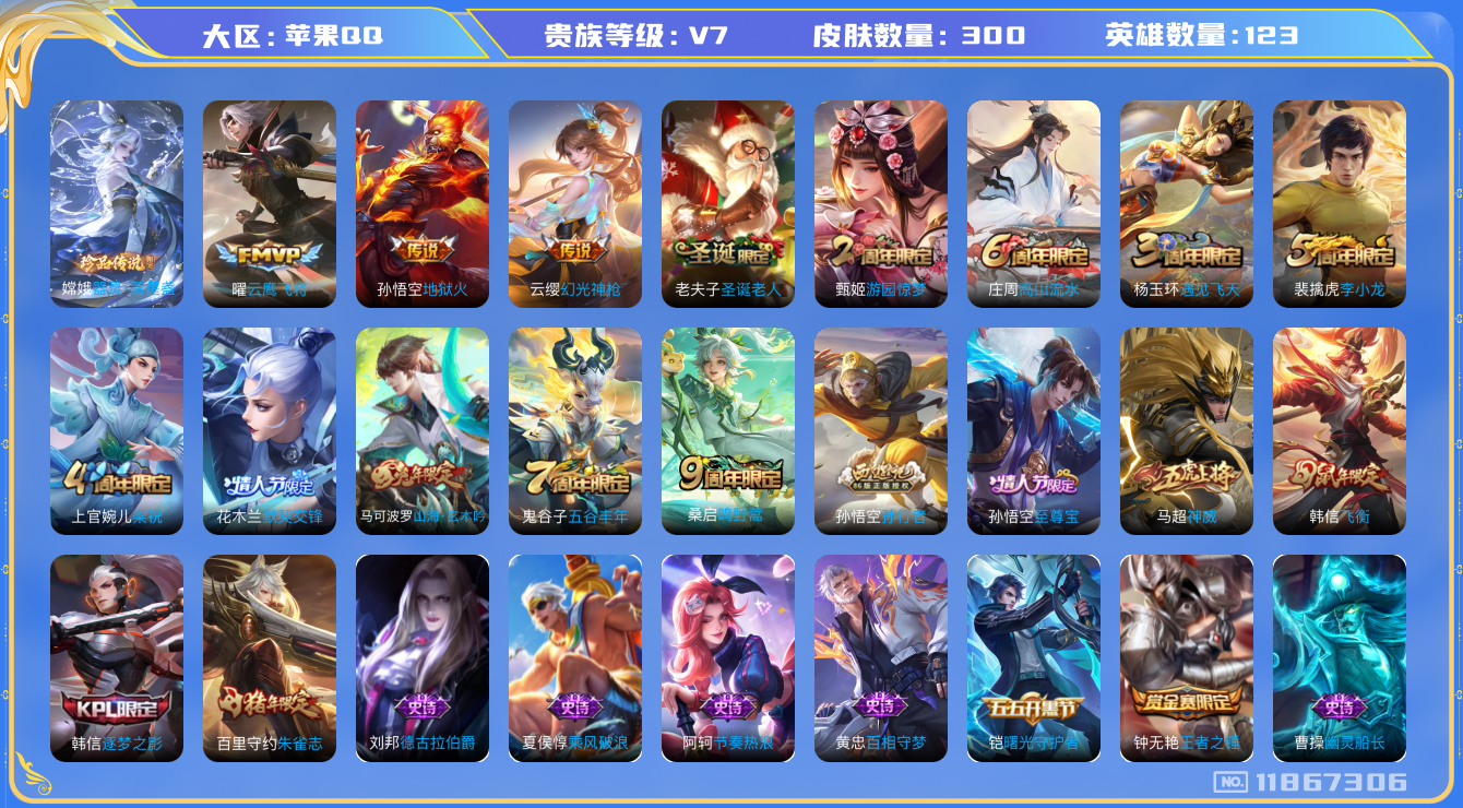 [11867306]V7 1珍品传说 4传说 123英雄 300皮肤 可修改实名 女号 优质装备:器灵·落星盏,云鹰飞将(小将军),地狱火,涂山容容 传说皮:幻光神枪 珍宝阁皮:妄想食味,蔷薇恋人,女武神 限定皮:鸣野蒿,至尊宝,神威(电光马子),飞衡(韩信年限),遇见飞天,高山流水,五谷丰年,游园惊梦,梁祝,李小龙,逐梦之影,朱雀志(守约年限),圣诞老人,默契交锋-花木兰,孙行者,山海·玄木吟(马可年限) 史诗皮:赞萌露比,星界战将,龙之律动,蒙犽顽岩魄,百相守梦-黄忠,守夜人,紫霞仙子,苍穹之光,白龙吟,黄金分割率,特工魅影,千年之狐,永昼,江河有灵,魅语,蒙恬荣光圣徽,偶像歌手,猫狗日记-孙策,乱世虎臣,节奏热浪,修罗,摇滚巨星,水果甜心,绅士熊喵,天才门将,星夜王子,心灵骇客,德古拉伯爵,暗隐猎兽者,幽灵船长,鬼剑武藏,心灵战警,地狱岩魂,纤云弄巧,拒霜思,乘风破浪,逐浪之夏,水晶猎龙者,曙光守护者,金属风暴,原初追逐者,圣诞狂欢,圣诞恋歌,鹰眼统帅,王者之锤,黎明之约,赏金猎手,无心,未来纪元-赵云
