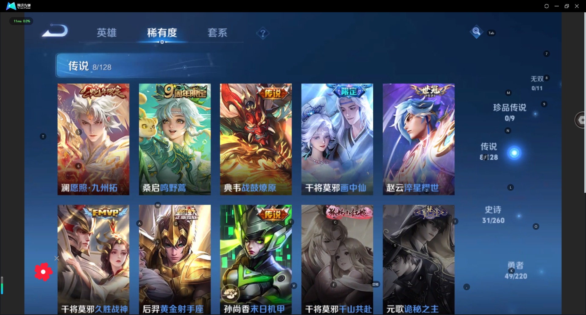 - PX_2103250-[金标雅典娜 金标诸葛亮 妹子号 紫瑶!!!]贵族等级: V6 英雄数: 124 皮肤数: 289 荣耀水晶: 星域神启 无双皮: 青丘·九尾,碎月剑心,小乔时之魔女,韩信群星魔术团 星传说: 时之愿境,金色仲夏夜,玉鸾吟 传说皮: 绛天战甲,猫影幻舞,炽阳神光,一念神魔,云霓雀翎,末日机甲-孙尚香,仲夏夜之梦,乞巧织情,游龙清影,挚爱之约,挚爱花嫁,无双飞将,记忆之芯,青丘