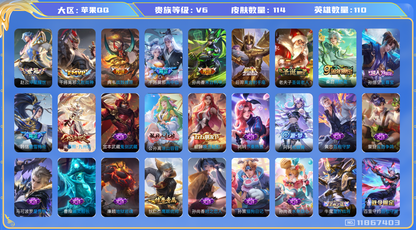 [11867403]V6 8传说 110英雄 114皮肤 可修改实名 优质装备:黄金射手座,久胜战神,末日机甲-孙尚香(绿蚂蚱),淬星耀世,画中仙,涂山容容 传说皮:典韦战鼓燎原 限定皮:愿照·九州拓(澜年限),鸣野蒿,至尊宝,傲雪梅枪,圣诞老人 史诗皮:化蝶舞,星界战将,龙之律动,百相守梦-周瑜,百相守梦-百里守约,星界特工,百相守梦-黄忠,紫霞仙子,电玩小子(小书包),黄金分割率,猫狗日记-孙策,时之恋人-孙尚香,节奏热浪,修罗,水果甜心,幽灵船长,鬼剑武藏,舞动绿茵,地狱岩魂,龙鼓争鸣,唤灵魅影,圣诞狂欢,鹰眼统帅,魅力维加斯