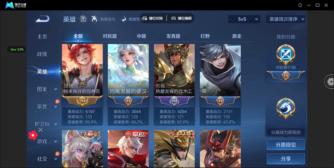 - [11529476]V6 5传说 125英雄 147皮肤 可修改实名 优质装备:黄金狮子座,涂山容容 传说皮:典韦战鼓燎原 珍宝阁皮:蔷薇恋人,玩趣恶龙 限定皮:愿照·九州拓(澜年限),愿照·山河定(司空震年限),五谷丰年,梁祝,时之祈愿-瑶(瑶传限),山海·玄木吟(马可年限) 史诗皮:器灵·浮梦炉,化蝶舞,龙之律动,石田雨龙,茶境仙,百相守梦-黄忠,织梦人,紫霞仙子,千年之狐,江河有灵,冰冠公主,青蛇,偶像歌手,猫狗日记-孙策,乱世虎臣,节奏热浪,修罗,摇滚巨星,水果甜心,暗隐猎兽者,幽灵船长,鬼剑武藏,圣诞狂欢,圣诞恋歌,鹰眼统帅,黎明之约,无心