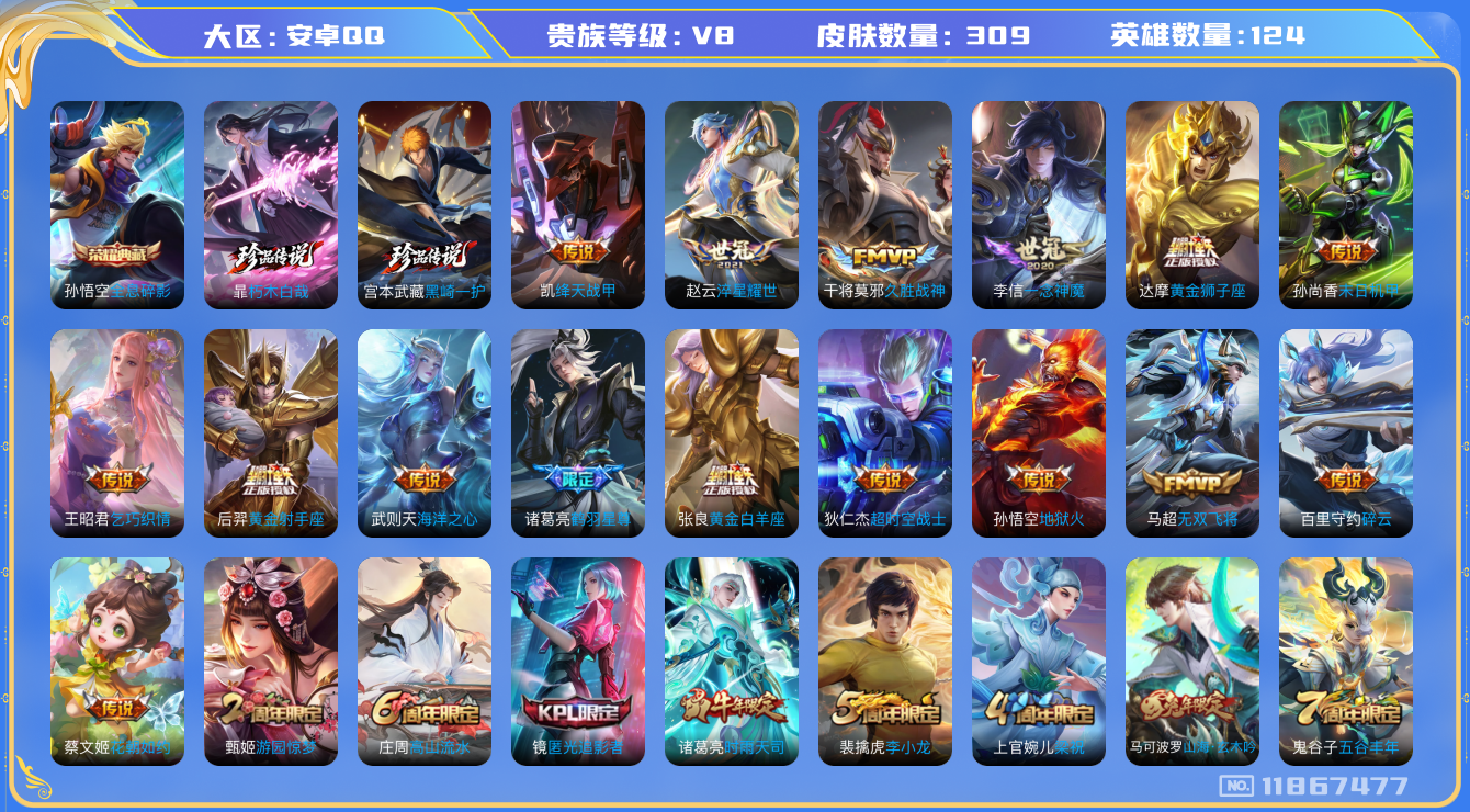 [11867477]V8 1典藏 2珍品传说 20传说 124英雄 309皮肤 可修改实名 优质装备:全息碎影(猴子典藏),朽木白哉,黑崎一护,黄金狮子座,黄金射手座,绛天战甲(鸡嘴战神),黄金白羊座,久胜战神,一念神魔,末日机甲-孙尚香(绿蚂蚱),地狱火,海洋之心,乞巧织情,淬星耀世,超时空战士-狄仁杰,花朝如约(花篮子),无双飞将,碎云,鹤羽星尊,涂山容容 珍宝阁皮:妄想食味,优雅恋人 限定皮:鸣野蒿,至尊宝,时雨天司(水龙头),飞衡(韩信年限),高山流水,齐天大圣,五谷丰年,游园惊梦,梁祝,李小龙,孙行者,猪悟能,大圣娶亲,匿光追影者,山海·玄木吟(马可年限) 史诗皮:石田雨龙,百相守梦-黄忠,白龙吟,黄金分割率,特工魅影,江河有灵,魅语,冰冠公主,青蛇,偶像歌手,白蛇,晚萤,电玩·爆裂旋风,暗夜猫娘,龙骑士(小龙虾),时之恋人-孙尚香,乱世虎臣,节奏热浪,修罗,女仆咖啡,摇滚巨星,水果甜心,绅士熊喵,星夜王子,心灵骇客,德古拉伯爵,暗隐猎兽者,幽灵船长,鬼剑武藏,心灵战警,舞动绿茵,地狱岩魂,纤云弄巧,繁星吟游(呼啦呼啦),水晶猎龙者,曙光守护者,箭羽风息,唤灵魅影,金属风暴,原初追逐者,圣诞狂欢,圣诞恋歌,鹰眼统帅,王者之锤,暗夜贵公子,魅力维加斯,黎明之约,未来纪元-赵云