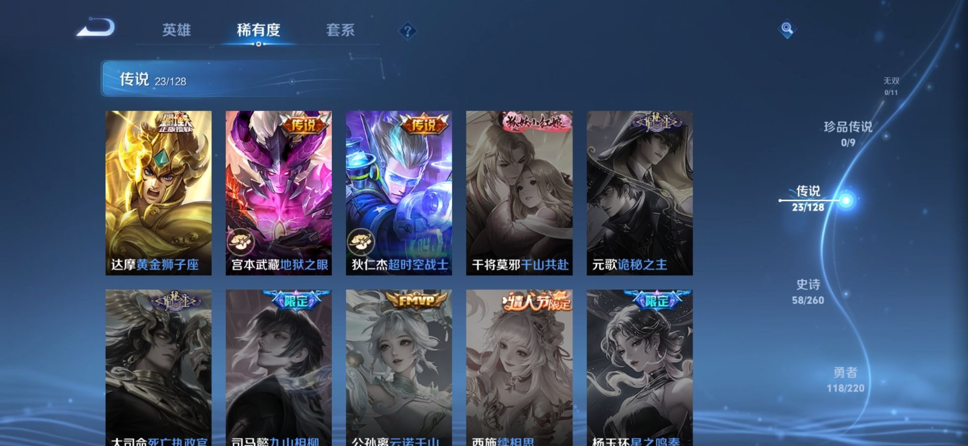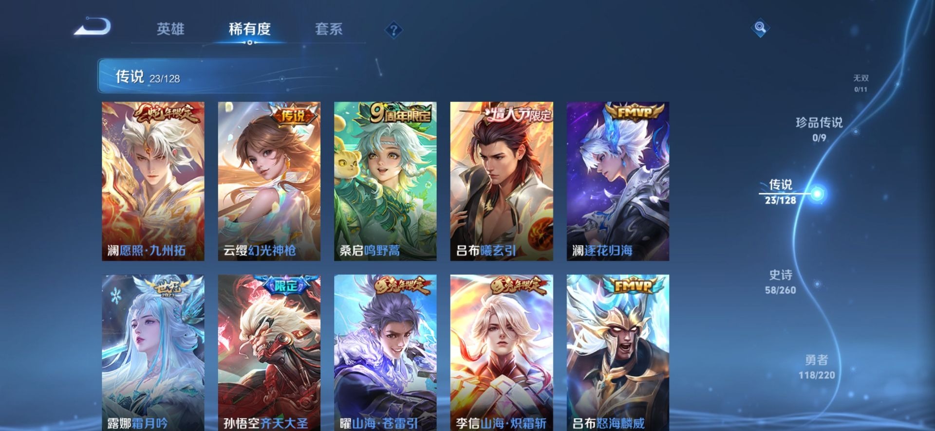 - PX_2086063-实名: 可修改 贵族等级: V6 英雄数: 125 皮肤数: 212 星传说: 幽冥之眼 传说皮: 地狱之眼,胖达荣荣,山海·炽霜斩,幻光神枪 限定皮: 李小龙,神威,如梦令-后羿,高山流水,五谷丰年,逐霄战戟,愿照·山河定,愿照·九州拓