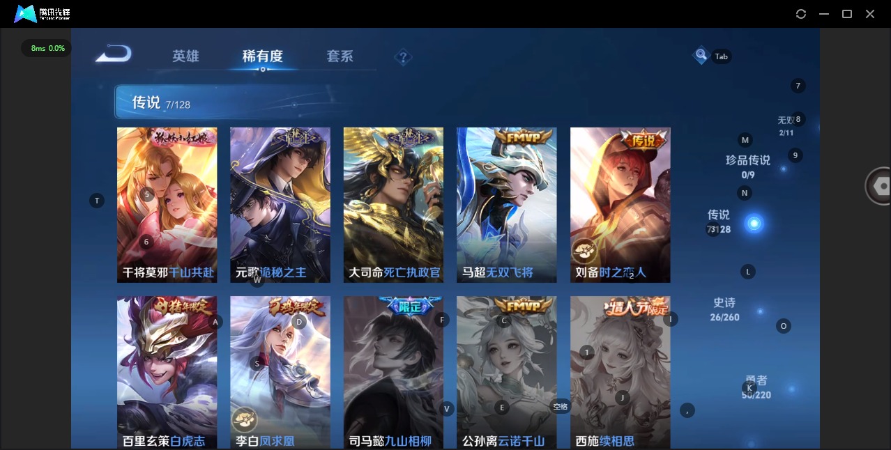 - PX_2094462-33 安卓QQ/最强王者/173皮肤/124英雄/0典藏/0珍品无双/0无双/0珍品传说/4传说/45史诗/8稀有英雄 【4 传说皮肤】炽阳神光 镜,久胜战神 干将莫邪,幻光神枪 云缨,鸣野蒿 桑启, 【45 史诗皮肤】电玩小子 鲁班七号,紫霞仙子 露娜,百解令 蒙犽,妄想食味 姬小满,山海·玄木吟 马可波罗,心灵战警 亚瑟,鬼剑武藏 宫本武藏,魅力维加斯 妲己,黄金分割率