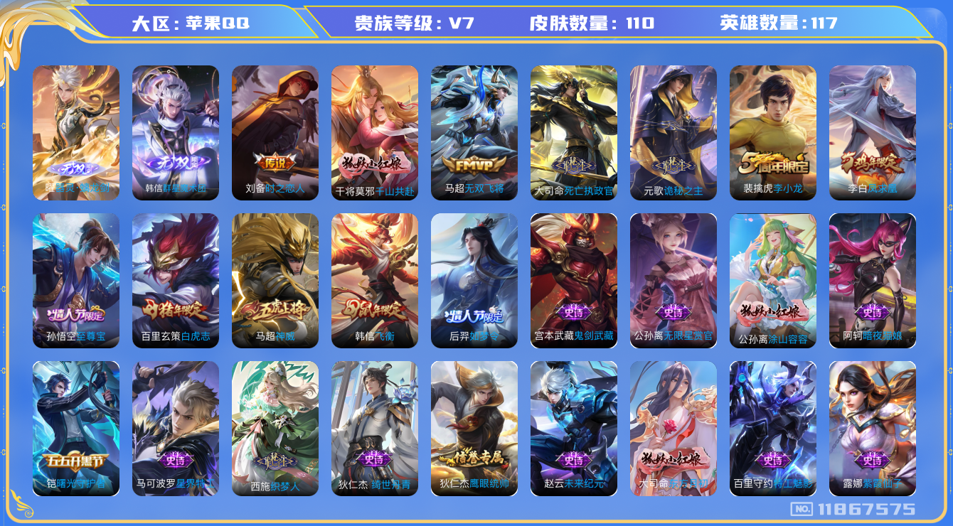 [11867575]V7 2无双 7传说 117英雄 110皮肤 可修改实名 优质装备:韩信群星魔术团(韩信无双),器灵·螭龙剑,时之恋人-刘备(电焊工),无双飞将,诡秘之主,千山共赴,涂山容容 传说皮:死亡执政官 限定皮:至尊宝,白虎志(电光耗子),凤求凰(白切鸡),神威(电光马子),飞衡(韩信年限),李小龙,如梦令-后羿 史诗皮:绮世丹青,龙之律动,百相守梦-周瑜,涂山红红,东方月初,星界特工,织梦人,守夜人,紫霞仙子,特工魅影,无限星赏官,暗夜猫娘,鬼剑武藏,曙光守护者,鹰眼统帅,魅力维加斯,未来纪元-赵云