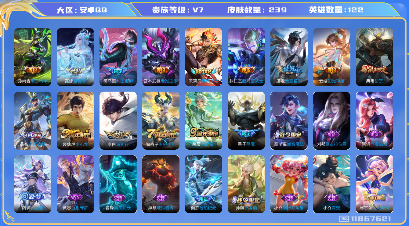 [11867621]V7 10传说 122英雄 239皮肤 可修改实名 优质装备:云霓雀翎,末日机甲-孙尚香(绿蚂蚱),地狱之眼,超时空战士-狄仁杰,霜月吟,涂山容容 传说皮:九山相柳,祥瑞亨通,幻光神枪 珍宝阁皮:蔷薇恋人 限定皮:逐霄战戟,鸣野蒿,诗剑行,降魔,五谷丰年,岱宗(典韦年限),李小龙 史诗皮:鸭鸭历险记-刘禅,狼魂孤将,绮世丹青,瑰影绮梦,化蝶舞,星界战将,龙之律动,百相守梦-周瑜,茶境仙,破空之剑,琥珀纪元伽罗,蔬乡物语(鲁班七号),百相守梦-百里守约,星界特工,百相守梦-黄忠,紫霞仙子,黄金分割率,江河有灵,百解令(蒙犽),高渐离燃音魔法,冰冠公主,青蛇,偶像歌手,电玩·爆裂旋风,末日机甲-吕布,节奏热浪,女仆咖啡,水果甜心,天才门将,星夜王子,心灵骇客,功夫厨神,德古拉伯爵,暗隐猎兽者,幽灵船长,鬼剑武藏,乐园奇幻夜,地狱岩魂,纤云弄巧,拒霜思,缤纷独角兽,逐浪之夏,水晶猎龙者,金属风暴,圣诞狂欢,圣诞恋歌,鹰眼统帅,魅力维加斯,未来纪元-赵云