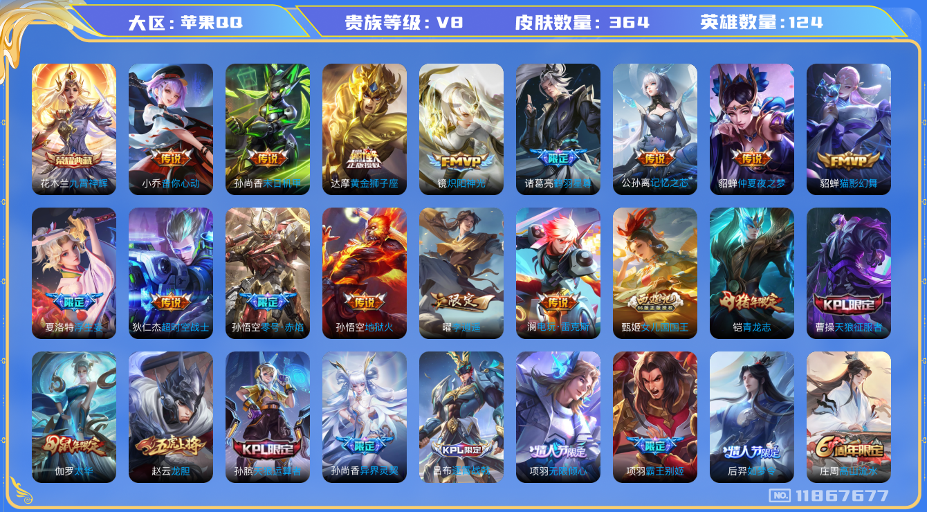 - [12082380]V8 2典藏 14传说 124英雄 289皮肤 可修改实名 优质装备:天鹅之梦(小乔典藏),幻阙歌(貂蝉典藏),云鹰飞将(小将军),久胜战神,仲夏夜之梦(大飞蛾),地狱之眼,音你心动-周瑜,山海·炽霜斩(李信年限),山海·琳琅生(小乔年限),山海·苍雷引(电光曜子) 珍宝阁皮:蔷薇恋人,女武神 限定皮:太华(伽罗年限),异界灵契(白毛香),寅虎·展翼(孙膑年限),时之彼端,白晶晶,神威(电光马子),飞衡(韩信年限),玄嵩(庄周年限),山海·碧波行(瑶年限),至美·化雀舞,遇见飞天,高山流水,齐天大圣,五谷丰年,冰锋战神,幽恒(沐浴露),天狼运算者,梁祝,天狼绘梦者,李小龙,霸王别姬-虞姬,奇迹圣诞,纯白花嫁,云端筑梦师,寅虎·心曲(虎婆),时之祈愿-瑶(瑶传限),山海·玄木吟(马可年限),冰霜神祇 史诗皮:化蝶舞,龙之律动,遇见神鹿,苍穹之光,电玩小子(小书包),特工魅影,千年之狐,江河有灵,魅语,蒙恬荣光圣徽,冰冠公主,青蛇,偶像歌手,晚萤,龙骑士(小龙虾),末日机甲-吕布,猫狗日记-孙策,时之恋人-孙尚香,乱世虎臣,节奏热浪,修罗,女仆咖啡,摇滚巨星,水果甜心,绅士熊喵,天才门将,星夜王子,心灵骇客,时之奇旅-安琪拉,功夫厨神,德古拉伯爵,暗隐猎兽者,幽灵船长,鬼剑武藏,心灵战警,舞动绿茵,地狱岩魂,纤云弄巧,繁星吟游(呼啦呼啦),拒霜思,缤纷独角兽,乘风破浪,逐浪之夏,水晶猎龙者,热力回旋,金属风暴,原初追逐者,圣诞狂欢,圣诞恋歌,鹰眼统帅,魅力维加斯,黎明之约,未来纪元-赵云