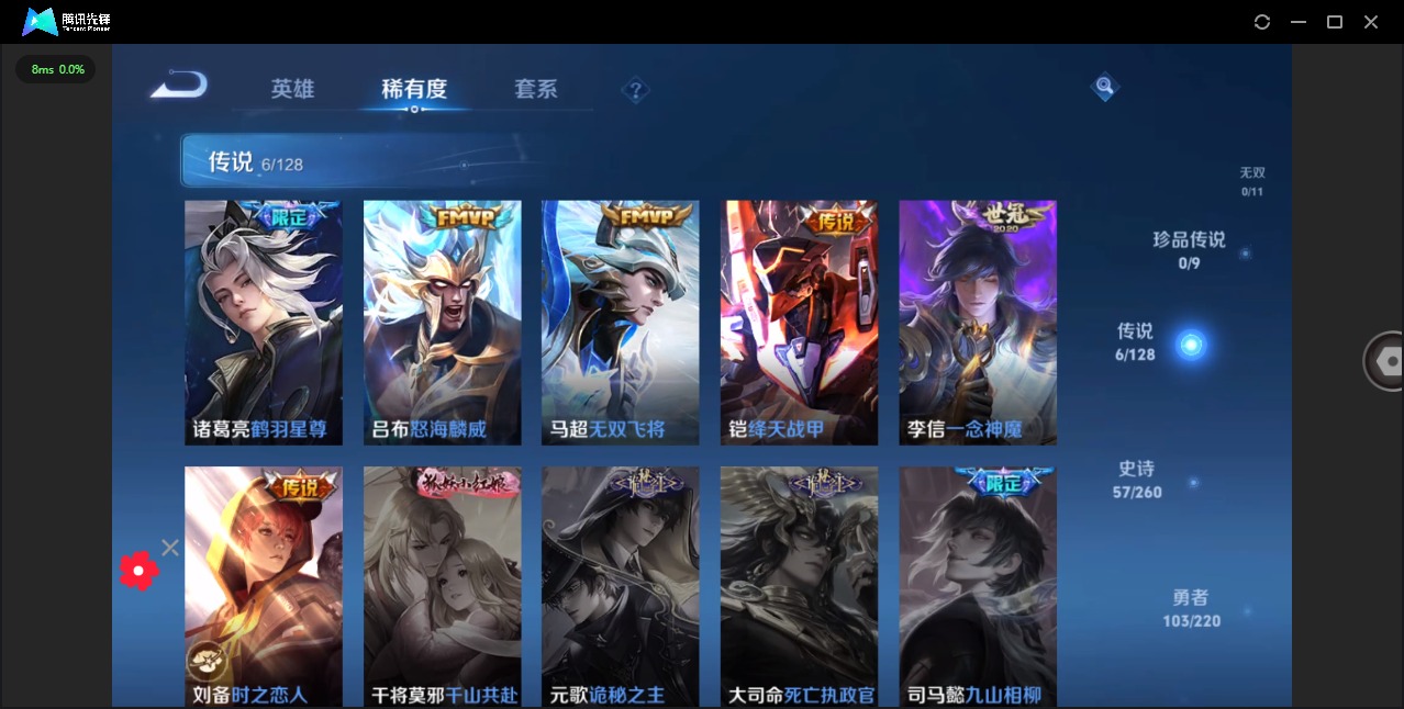 - [11515653]V8 3典藏 18传说 124英雄 358皮肤 可修改实名 优质装备:鸣剑·曳影,星域神启(倪克斯贼亮),弑枪猎影(韩信典藏),零号·赤焰,地狱之眼,淬星耀世,挚爱之约,无双飞将 传说皮:死亡执政官,幻光神枪 珍宝阁皮:胡桃夹子,蔷薇恋人,女武神 限定皮:愿照·众生和(妲己年限),逐霄战戟,鸣野蒿,武陵仙君(小桃花),异界灵契(白毛香),傲雪梅枪,时雨天司(水龙头),飞衡(韩信年限),高山流水,齐天大圣,匿光决锋者,五谷丰年,游园惊梦,梁祝,天狼狩猎者,天狼溯光者,李小龙,逐梦之影,如梦令-后羿,孙行者,猪悟能,青春决赛季,乒乒小将,蜜橘之夏,匿光追影者,女儿国国王,寅虎·御盾(廉颇年限),寅虎·瑞焰(虎皮蛋子),寅虎·心曲(虎婆),寅虎·赤拳(老虎年限),时之祈愿-云中君,百木心枪,玉兔公主,无尽星芒,深海之息(深海大菠萝),匿光启智者,时之奇旅-妲己,山海·玄木吟(马可年限) 史诗皮:器灵·浮梦炉,化蝶舞,星界战将,龙之律动,石田雨龙,百相守梦-周瑜,蔬乡物语(鲁班七号),紫霞仙子,电玩小子(小书包),白龙吟,黄金分割率,特工魅影,千年之狐,江河有灵,百解令(蒙犽),高渐离燃音魔法,蒙恬荣光圣徽,偶像歌手,龙骑士(小龙虾),暗夜猫娘,末日机甲-吕布,猫狗日记-大乔,乱世虎臣,节奏热浪,修罗,女仆咖啡,摇滚巨星,水果甜心,绅士熊喵,天才门将,星夜王子,心灵骇客,时之奇旅-安琪拉,功夫厨神,德古拉伯爵,暗隐猎兽者,幽灵船长,鬼剑武藏,心灵战警,舞动绿茵,地狱岩魂,纤云弄巧,繁星吟游(呼啦呼啦),拒霜思,缤纷独角兽,乘风破浪,逐浪之夏,月团寄思,水晶猎龙者,曙光守护者,箭羽风息,金属风暴,原初追逐者,圣诞狂欢,圣诞恋歌,鹰眼统帅,魅力维加斯,黎明之约,天秀·音浪,寅虎·御盾,无心,未来纪元-赵云