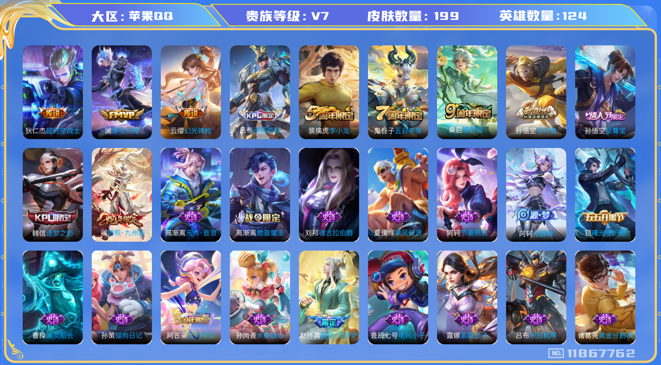 [11867762]V7 5传说 124英雄 199皮肤 可修改实名 优质装备:超时空战士-狄仁杰,澜逐花归海 传说皮:幻光神枪 珍宝阁皮:胡桃夹子,蔷薇恋人 限定皮:愿照·九州拓(澜年限),逐霄战戟,鸣野蒿,至尊宝,五谷丰年,李小龙,逐梦之影,孙行者 史诗皮:器灵·浮梦炉,化蝶舞,紫霞仙子,电玩小子(小书包),黄金分割率,特工魅影,千年之狐,江河有灵,百解令(蒙犽),高渐离燃音魔法,末日机甲-吕布,猫狗日记-孙策,节奏热浪,修罗,女仆咖啡,摇滚巨星,水果甜心,星夜王子,心灵骇客,功夫厨神,德古拉伯爵,幽灵船长,鬼剑武藏,纤云弄巧,繁星吟游(呼啦呼啦),乘风破浪,逐浪之夏,曙光守护者,金属风暴,圣诞恋歌,鹰眼统帅,暗夜贵公子,魅力维加斯,赏金猎手,天秀·音浪,未来纪元-赵云