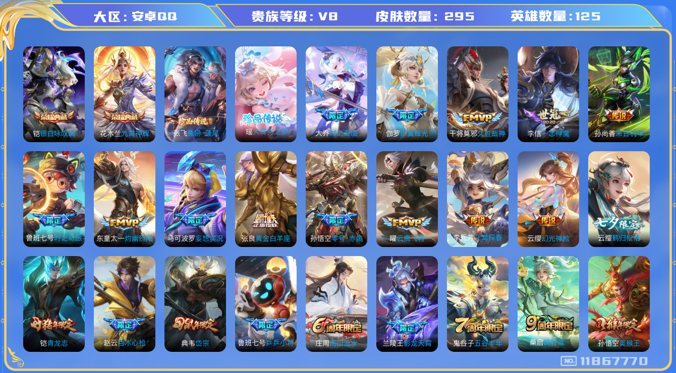 [11867770]V8 2典藏 2珍品传说 18传说 125英雄 295皮肤 可修改实名 优质装备:九霄神辉(木兰典藏),银白咏叹调(倪克斯侍卫),大耳狗之梦,云鹰飞将(小将军),黄金白羊座,久胜战神,一念神魔,末日机甲-孙尚香(绿蚂蚱),零号·赤焰,飞鸢探春,炽翼辉光(娃娃菜牛角包),灼幽烈阳,妄想实况,鹤归松栖(云缨),鲁班七号-时之奇旅,大乔-时之奇旅 珍品传说:兔狲·蓬尾 传说皮:幻光神枪 珍宝阁皮:妄想食味,女武神 限定皮:愿照·众生和(妲己年限),鸣野蒿,影龙天霄,高山流水,五谷丰年,青龙志(铠年限),岱宗(典韦年限),乒乒小将,美猴王,百木心枪 史诗皮:器灵·浮梦炉,化蝶舞,星界战将,龙之律动,雪豹·霜爪,蒙犽顽岩魄,百相守梦-百里守约,百相守梦-黄忠,遇见神鹿,紫霞仙子,苍穹之光,电玩小子(小书包),黄金分割率,江河有灵,鹤归松栖(赵怀真),雪夜绮愿(周瑜),浮梦罗烟,百解令(蒙犽),高渐离燃音魔法,蒙恬荣光圣徽,冰冠公主,偶像歌手,晚萤,电玩·爆裂旋风,猫狗日记-孙策,猫狗日记-大乔,时之恋人-孙尚香,乱世虎臣,节奏热浪,女仆咖啡,摇滚巨星,水果甜心,星夜王子,心灵骇客,时之奇旅-安琪拉,功夫厨神,德古拉伯爵,暗隐猎兽者,鬼剑武藏,心灵战警,天秀·启明,舞动绿茵,地狱岩魂,纤云弄巧,繁星吟游(呼啦呼啦),拒霜思,缤纷独角兽,乘风破浪,逐浪之夏,水晶猎龙者,金属风暴,圣诞狂欢,圣诞恋歌,鹰眼统帅,暗夜贵公子,魅力维加斯,赏金猎手,天秀·音浪,无心,未来纪元-赵云