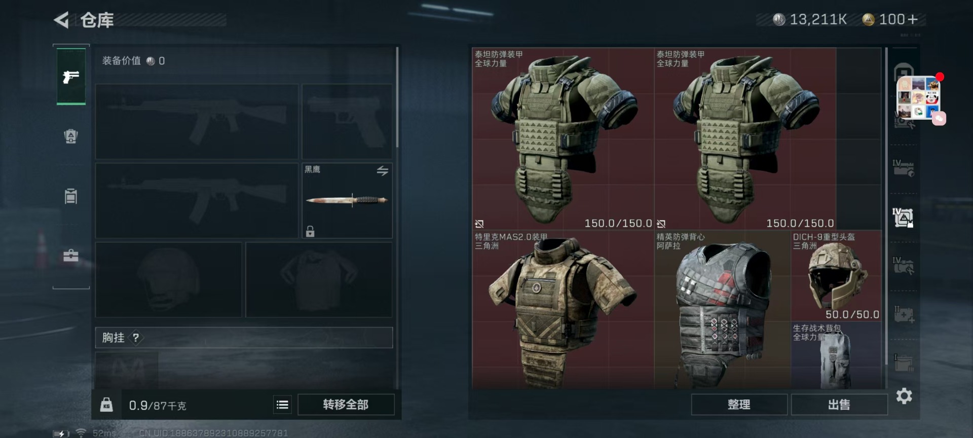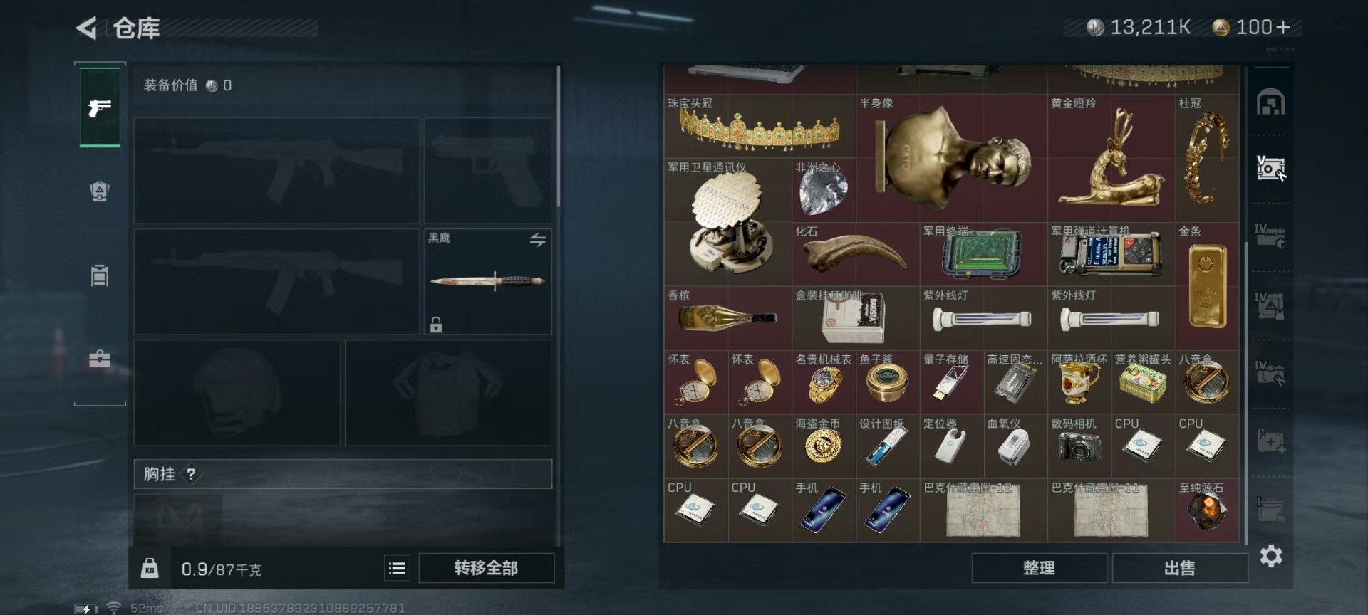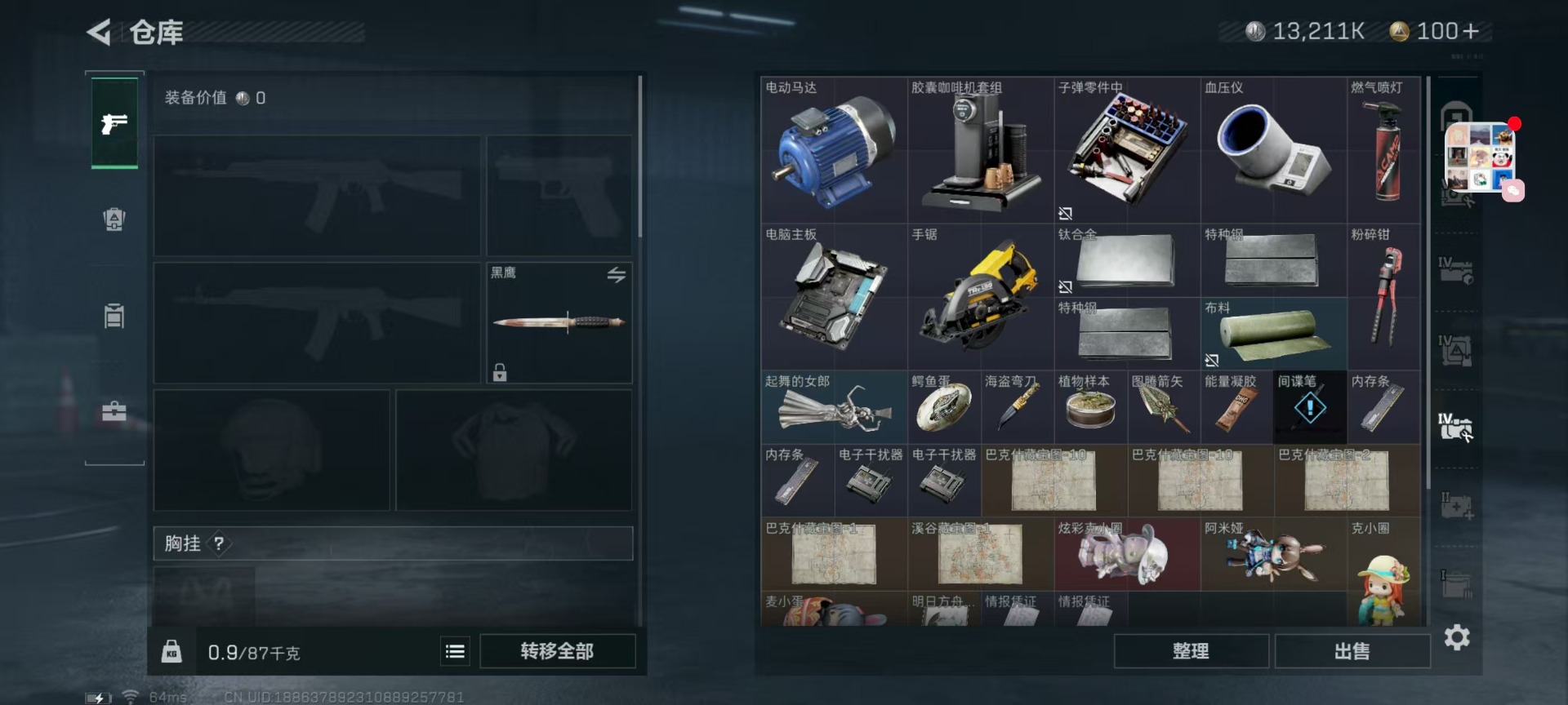 [11567789]总资产:102.1M 4传说枪械 哈夫币:13.211K 可二次 可修改实名 烽火地带段位:青铜 全面战场段位:列兵 传说武器皮肤:勇士冲锋枪-能天使-午夜邮差,725双管霰弹枪-送葬人-无题密令,M4A1突击步枪-阿米娅,复合弓-黑-天际线