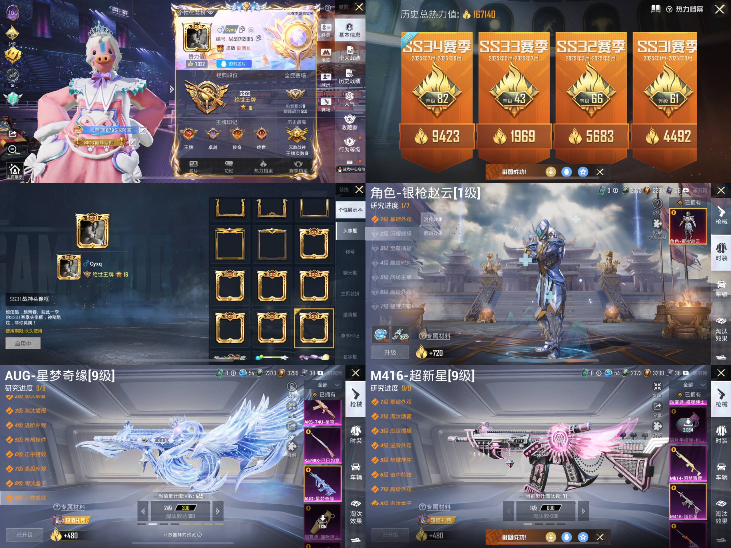 M416-五爪金龙,AKM-甜心宝贝,SCAR-L-梦幻火箭,GROZA-香水柠檬,AUG-星之彼岸,M762-甜蜜誓约,M24-星之信仰,UMP45-雪国精灵,Kar98K-绿意幻情,M416-暖熊萌萌,P90-甜蜜草莓,Kar98K-未来歌姬,AMR-炫光之旅,平底锅-林间仙鹿,M416-超新星,Mk14-闲梦青缨,破片手榴弹-粉粉猫爪,烟雾弹-猫咪绅士,AUG-星梦奇缘,Kar98K-巳巳如意