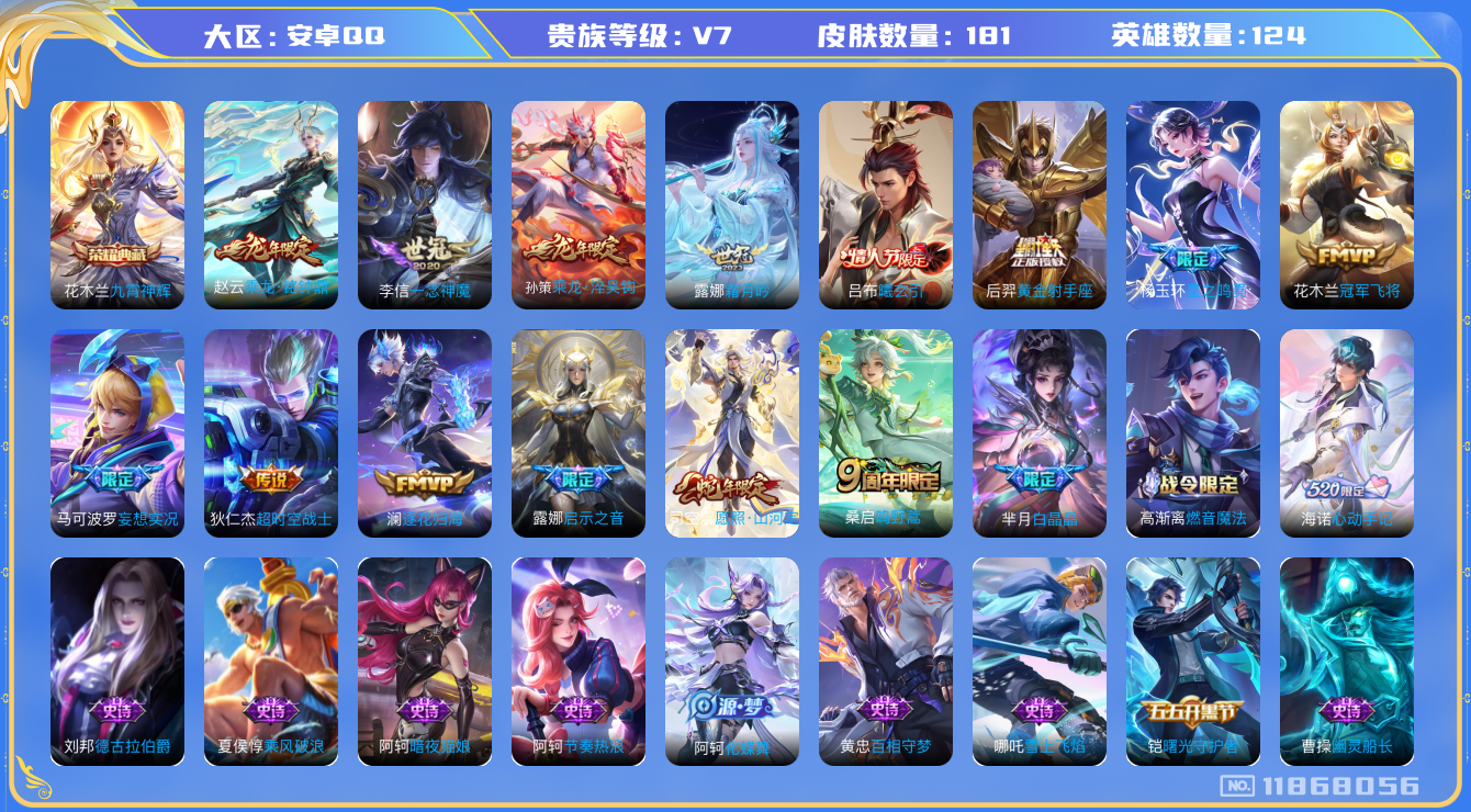 [11868056]V7 1典藏 14传说 124英雄 181皮肤 可修改实名 优质装备:九霄神辉(木兰典藏),黄金射手座,冠军飞将,一念神魔,超时空战士-狄仁杰,妄想实况,霜月吟,澜逐花归海 传说皮:乘龙·铭钟鼎(赵云年限),乘龙·淬吴钩(孙策年限),吕布曦玄引,星之鸣奏 珍宝阁皮:优雅恋人 限定皮:愿照·山河定(司空震年限),鸣野蒿,白晶晶,启示之音 史诗皮:鸭鸭历险记-刘禅,化蝶舞,星界战将,龙之律动,茶境仙,破空之剑,东方月初,蒙犽顽岩魄,埋骨钱,海诺心动手记,琥珀纪元伽罗,蔬乡物语(鲁班七号),百相守梦-百里守约,百相守梦-黄忠,紫霞仙子,特工魅影,百解令(蒙犽),高渐离燃音魔法,冰冠公主,青蛇,偶像歌手,暗夜猫娘,乱世虎臣,节奏热浪,水果甜心,星夜王子,功夫厨神,德古拉伯爵,幽灵船长,鬼剑武藏,暗渊魔法,乐园奇幻夜,天秀·启明,地狱岩魂,纤云弄巧,繁星吟游(呼啦呼啦),拒霜思,乘风破浪,逐浪之夏,水晶猎龙者,曙光守护者,金属风暴,原初追逐者,鹰眼统帅,魅力维加斯,雪上飞焰,玫瑰异探